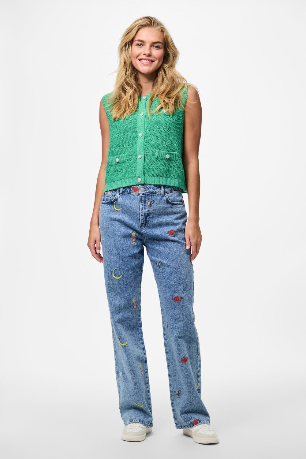 Dit stijlvolle WINTER GREEN gilet van Pieces voegt een vleugje verfijning toe aan je garderobe. Het gilet is vervaardigd uit een duurzame blend van 50% katoen en 50% gerecycled polyester, wat bijdraagt aan zowel een comfortabele als ecologische keuze. Met een regular fit en een klassieke ronde hals biedt het een tijdloze uitstraling. De knoopsluiting met opvallende knopen voegt een speels detail toe aan het geheel, waardoor dit gilet perfect is voor diverse settings. Of je nu een dag op kantoor hebt of een informele bijeenkomst bijwoont, dit gilet biedt een veelzijdige en modieuze optie. De structuur in de stof voegt een subtiel textuureffect toe, wat het gilet net dat beetje extra geeft. Dankzij het mouwloze ontwerp is het eenvoudig te combineren over een blouse of T-shirt, ideaal voor de herfstige dagen. Combineer het met een jeans voor een casual look of met een rok voor een elegantere touch. Dit gilet is een veelzijdige aanvulling die je moeiteloos kunt stylen voor uiteenlopende gelegenheden. Voeg met dit Pieces gilet een modern en duurzaam element toe aan je outfits.