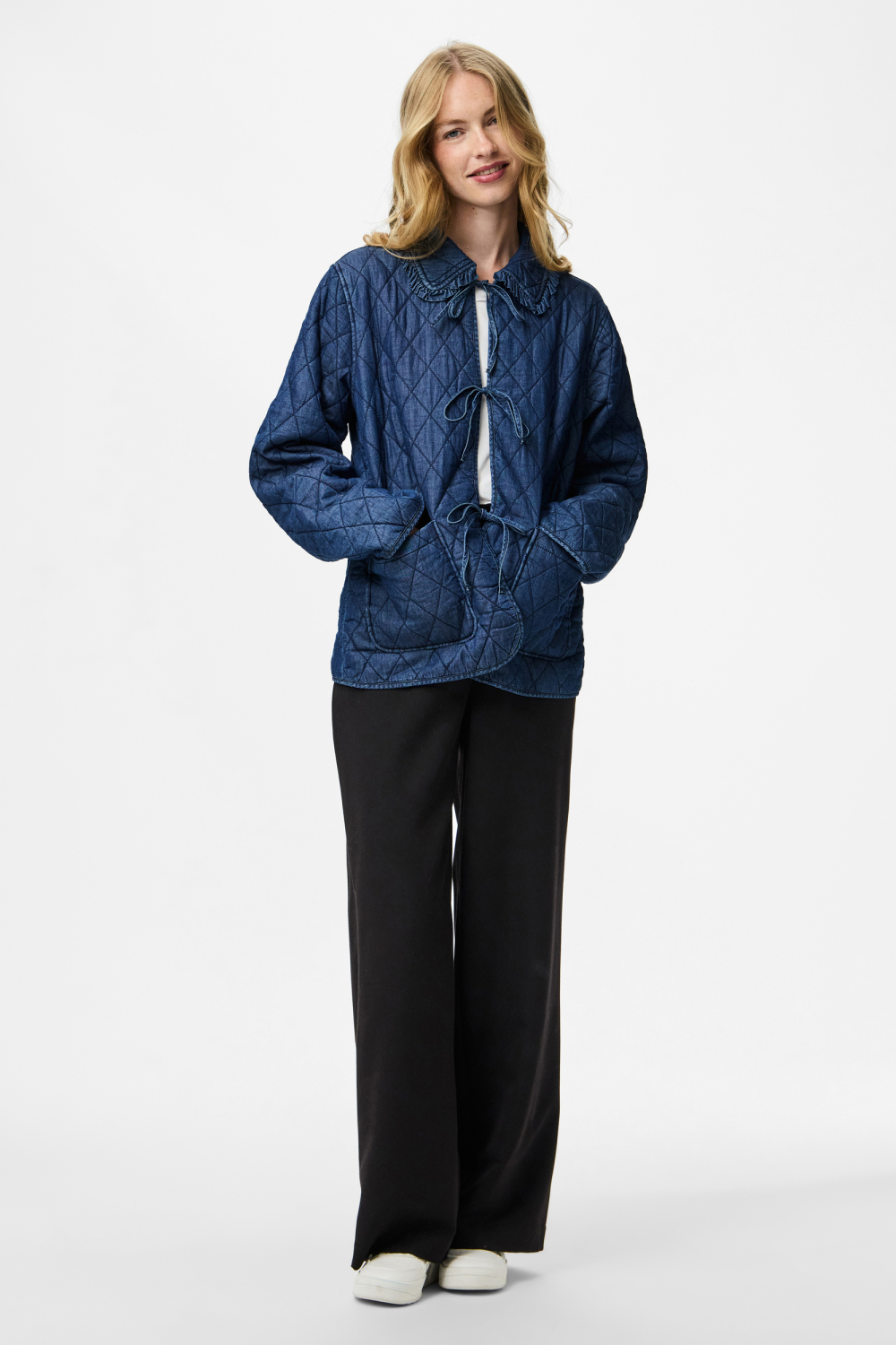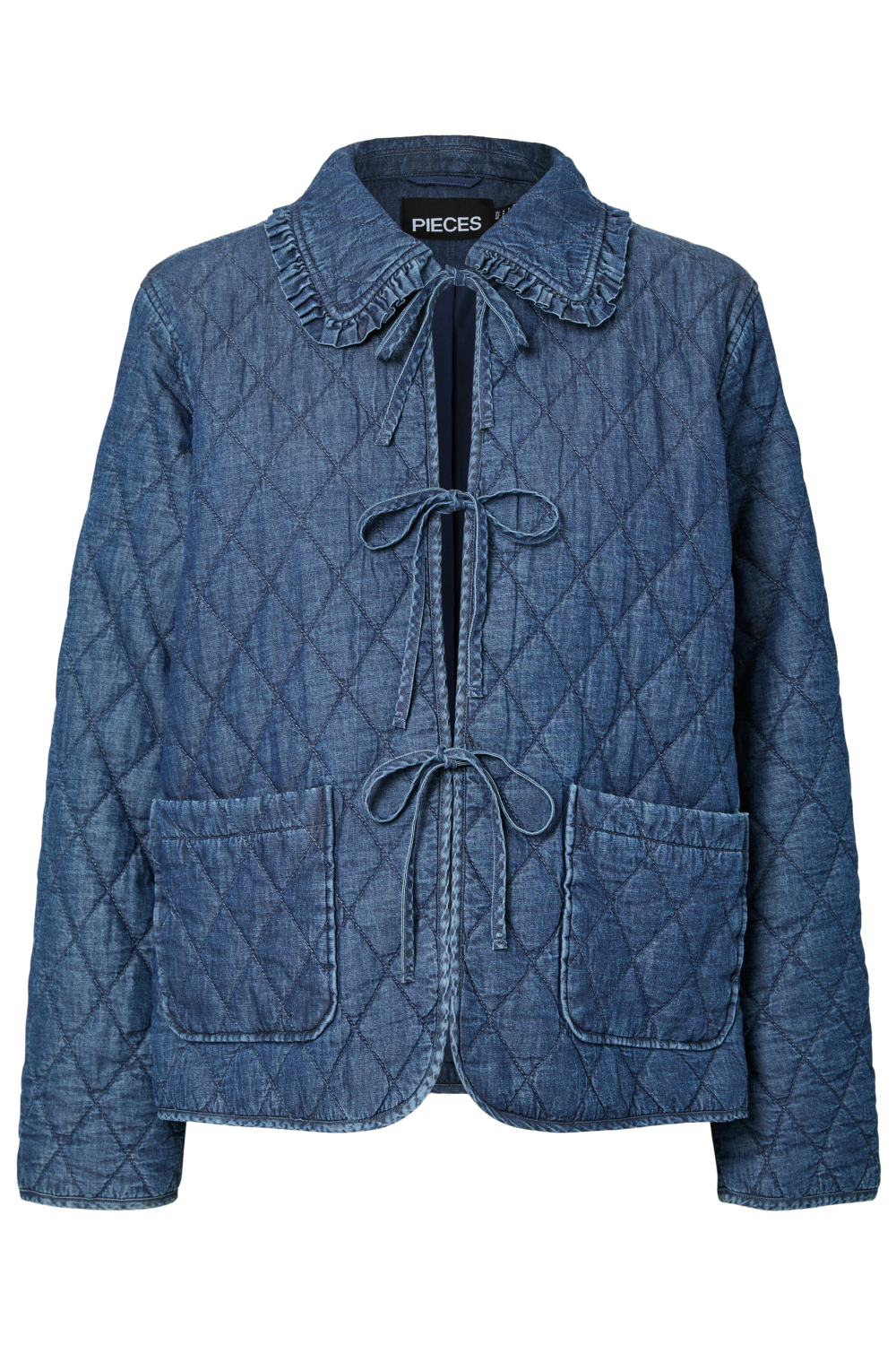 Deze casual jas van Pieces biedt jou een stijlvolle aanvulling voor de frisse herfstdagen. Het medium blue denim design valt op door de gewatteerde structuur en diamantvormige stiksels. Gemaakt van 100% katoen, voelt de jas comfortabel aan en zorgt de polyester voering voor extra warmte. Met een regular fit en lange mouwen, biedt het de perfecte balans tussen draagcomfort en een trendy uitstraling. De puntkraag met subtiele ruches en de strikkoorden geven de jas een unieke twist die jouw outfit compleet maakt.