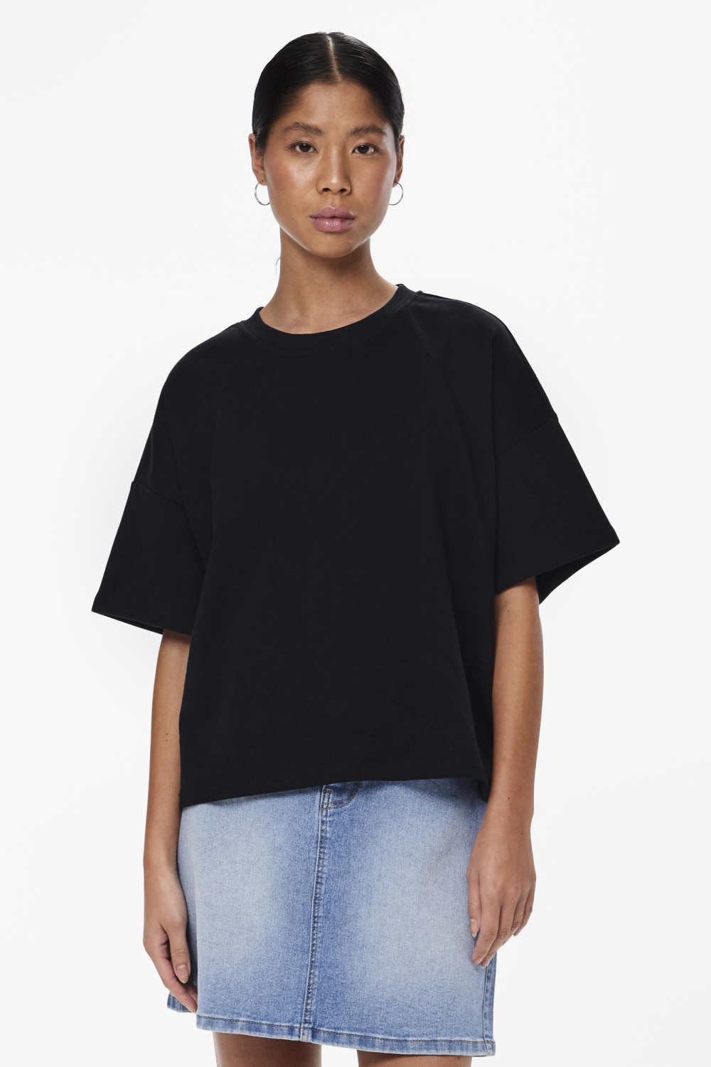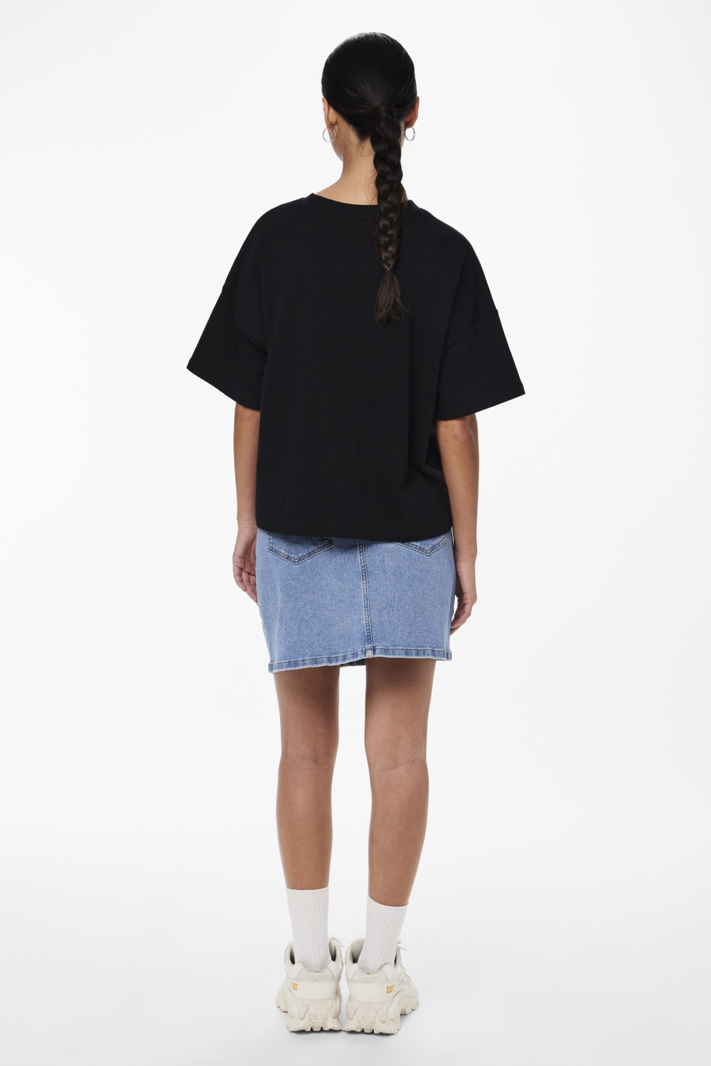Deze casual zwarte sweater van Pieces is een eigentijdse toevoeging aan je lente-garderobe. Met zijn oversized pasvorm en comfortabele materiaal van 50% katoen en 50% polyester, biedt deze trui je een luchtige en relaxte look. De ronde hals en korte mouwen zorgen voor een moderne uitstraling die perfect past bij elke lente-outfit. Of je nu een dagje de stad in gaat of een gezellige brunch met vrienden hebt, deze sweater houdt je stijlvol en comfortabel. De sweater is veelzijdig en eenvoudig te combineren met verschillende kledingstukken. Draag hem bijvoorbeeld met een denim rok voor een nonchalante look, zoals op de foto's te zien is. De neutrale zwarte kleur maakt het gemakkelijk om dit stuk met kleurrijke accessoires te combineren. Of je hem nu stijlvol draagt of juist kiest voor een sportievere uitstraling met sneakers, deze Pieces sweater past naadloos in elke casual setting.