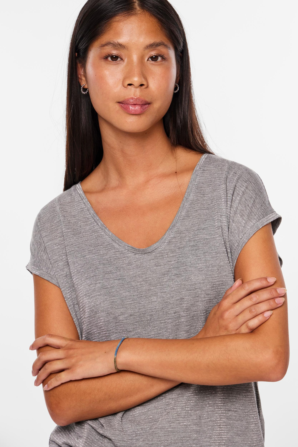 Dit Pieces T-shirt in de kleur Light Grey Melange is een elegante toevoeging aan jouw casual garderobe. Met een subtiele V-hals en korte mouwen, biedt dit shirt een veelzijdige stijl die gemakkelijk te combineren is. Gemaakt van een zachte mix van 85% viscose, 10% metaalgaren en 5% elastan, voelt het comfortabel aan op de huid. De glinsterende lurex draad voegt een vleugje glamour toe, waardoor het een fijne keuze is voor zowel overdag als ’s avonds. De regular fit en normale lengte maken het Pieces T-shirt ideaal voor diverse gelegenheden. Combineer het eenvoudig met een jeans voor een relaxte look, of draag het onder een blazertje voor een iets formelere uitstraling. Of je nu naar een casual brunch gaat of een middagje winkelen, met dit shirt kom je altijd goed voor de dag. Dankzij het tijdloze design en de neutrale kleur kan het elk seizoen gedragen worden.