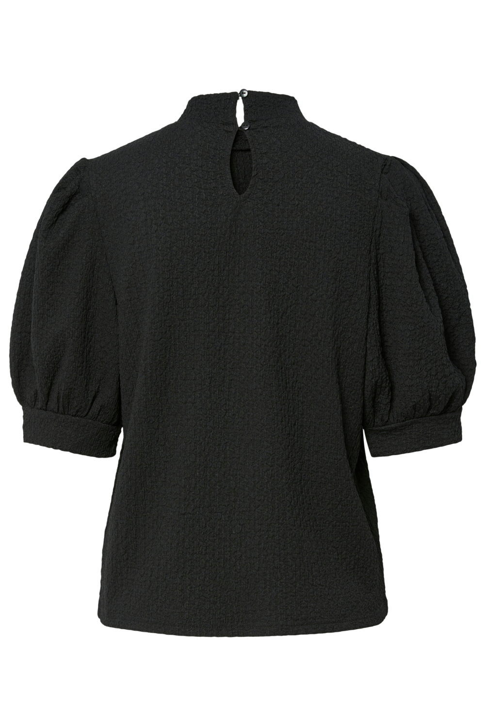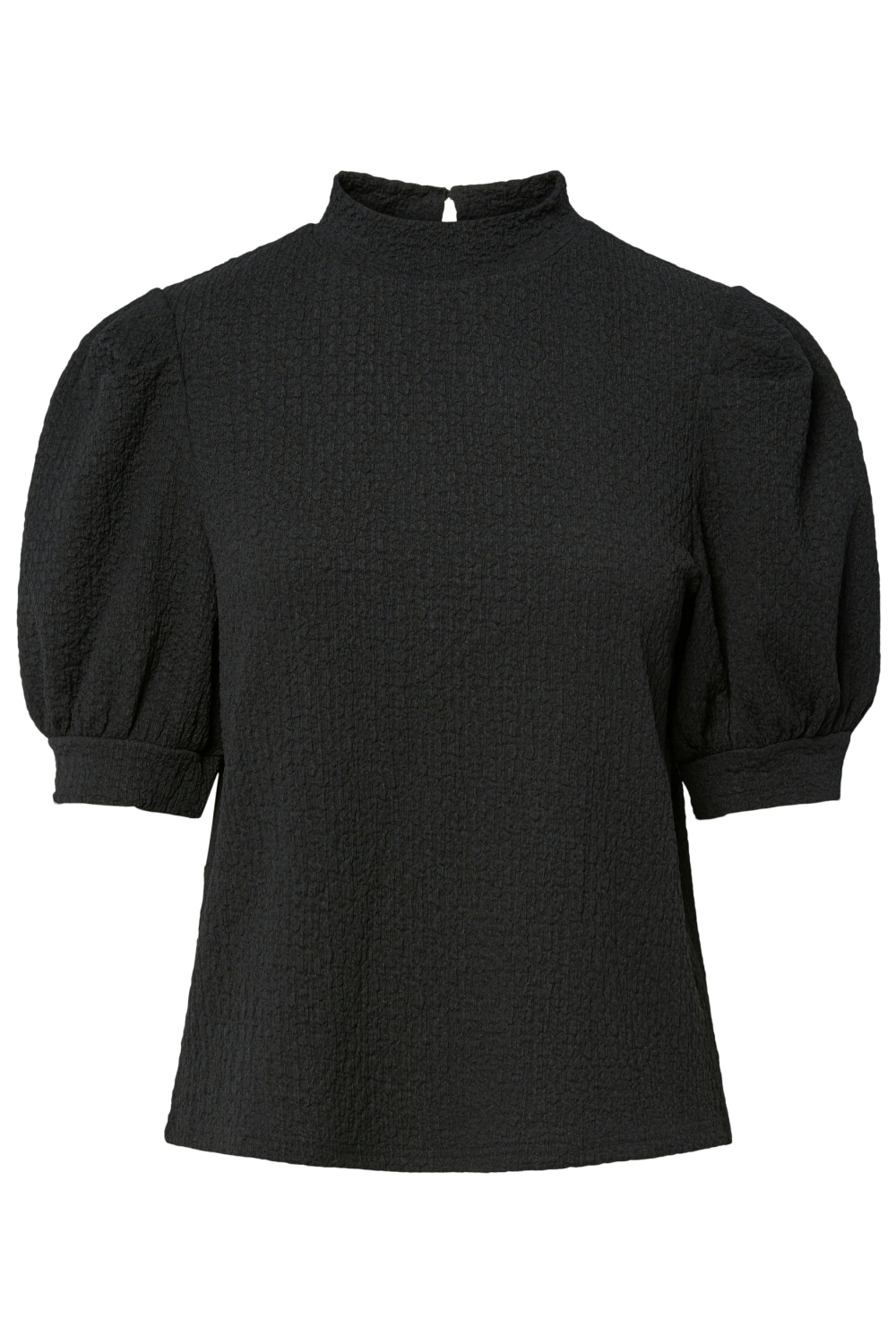 Dit elegante zwarte T-shirt van Pieces is een verfijnde toevoeging aan je herfstgarderobe. Gemaakt van duurzaam 99% gerecycled polyester en 1% elastan, biedt het een comfortabele en milieuvriendelijke keuze. De high neck en de opvallende korte mouwen met een subtiele pof geven het T-shirt een modieuze twist. De structuur in de stof zorgt voor een extra dimensie en maakt het geschikt voor zowel casual als nette gelegenheden. De regular fit en normale lengte maken dit T-shirt veelzijdig om te dragen. Het sluit met een elegante knoopsluiting aan de achterkant, wat een extra detail toevoegt aan het geheel. Combineer het met je favoriete jeans voor een relaxte dag of stijl het op met een rok voor een avondje uit. Dit T-shirt past moeiteloos in diverse outfits, of je nu naar kantoor gaat of een informele bijeenkomst hebt, het zorgt altijd voor een stijlvolle uitstraling.