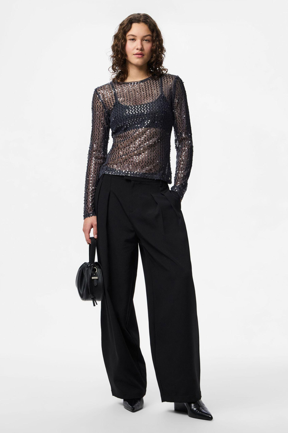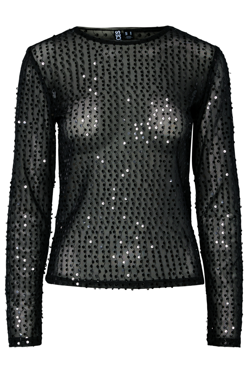 Dit opvallende T-shirt van Pieces is een echte blikvanger in je wintergarderobe. De zwarte pailletten geven het shirt een feestelijke uitstraling, perfect voor een avondje uit of een speciale gelegenheid. Dankzij de regular fit zit het comfortabel en flatteert het verschillende lichaamsvormen. Met een ronde hals en lange mouwen biedt het een elegante en tijdloze look die veelzijdig te combineren is.
