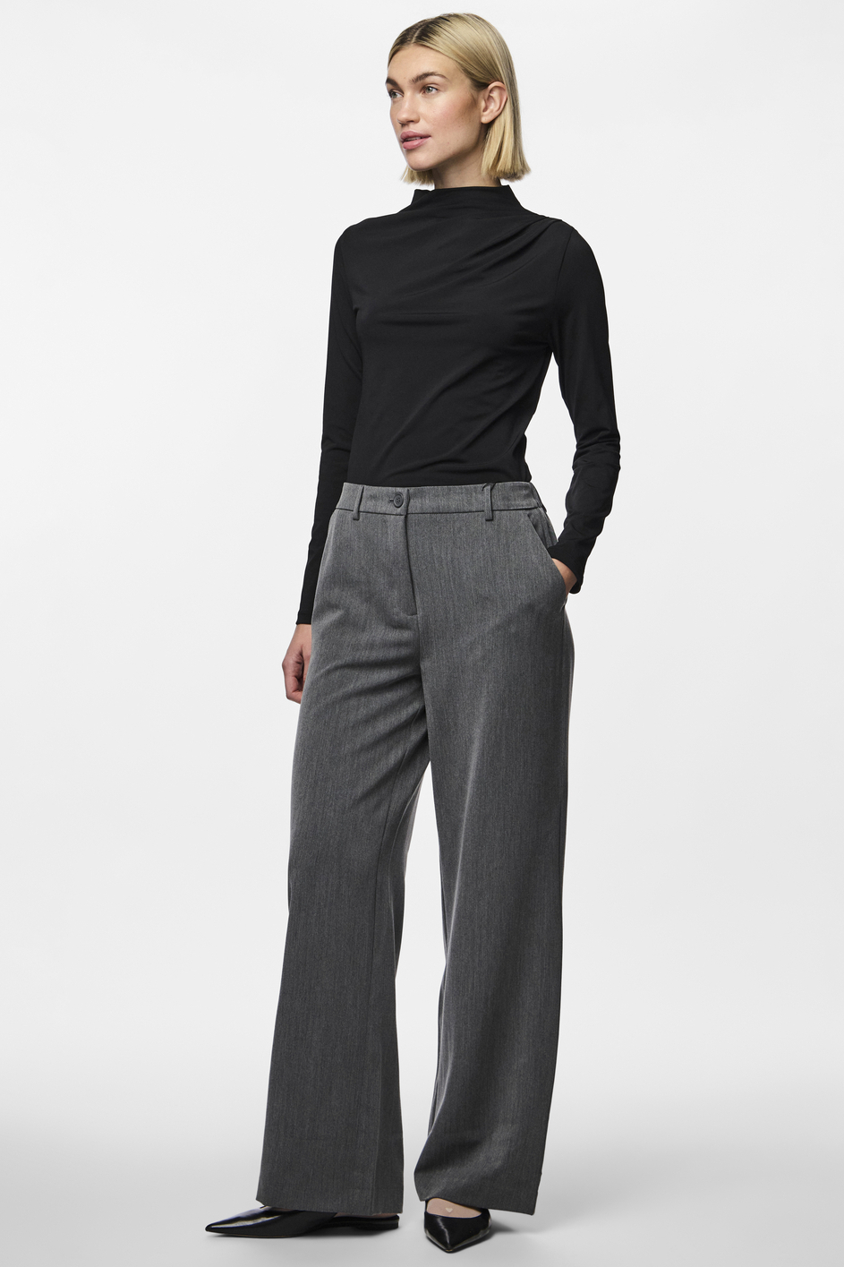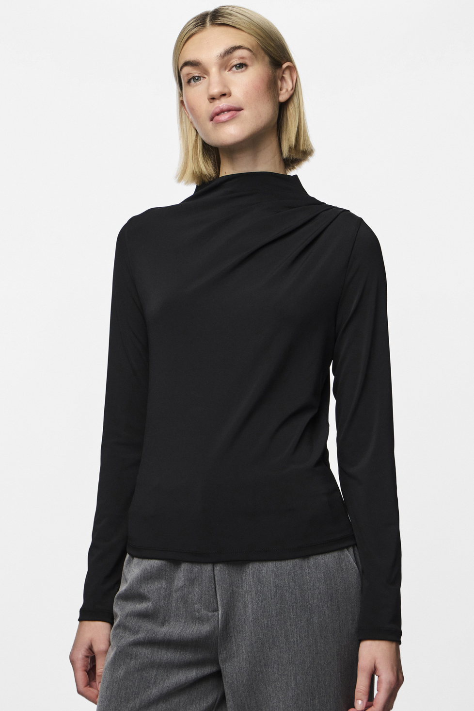 Dit zwarte T-shirt van Pieces is een veelzijdige toevoeging aan jouw garderobe. Gemaakt van 95% gerecycled polyester en 5% elastan, biedt het een comfortabele en duurzame keuze voor dagelijks gebruik. De regular fit en elegante high neck zorgen voor een verfijnde uitstraling, ideaal voor zowel casual als meer formele gelegenheden. De lange mouwen maken het perfect voor het voor- en najaar, terwijl de subtiele plooidetails op de schouder net dat beetje extra geven aan je outfit. Met zijn tijdloze zwarte kleur is dit Pieces shirt eenvoudig te combineren met verschillende stijlen. Draag het met een nette broek voor een chique kantooroutfit of kies voor een casual jeans tijdens een ontspannen middag. De normale lengte en het soepele materiaal bieden veel comfort, ongeacht de gelegenheid. Dit T-shirt is een uitstekende keuze voor elke dag dat je een stijlvolle maar eenvoudige look wilt creëren.