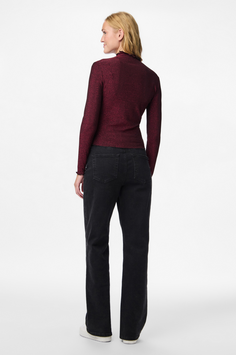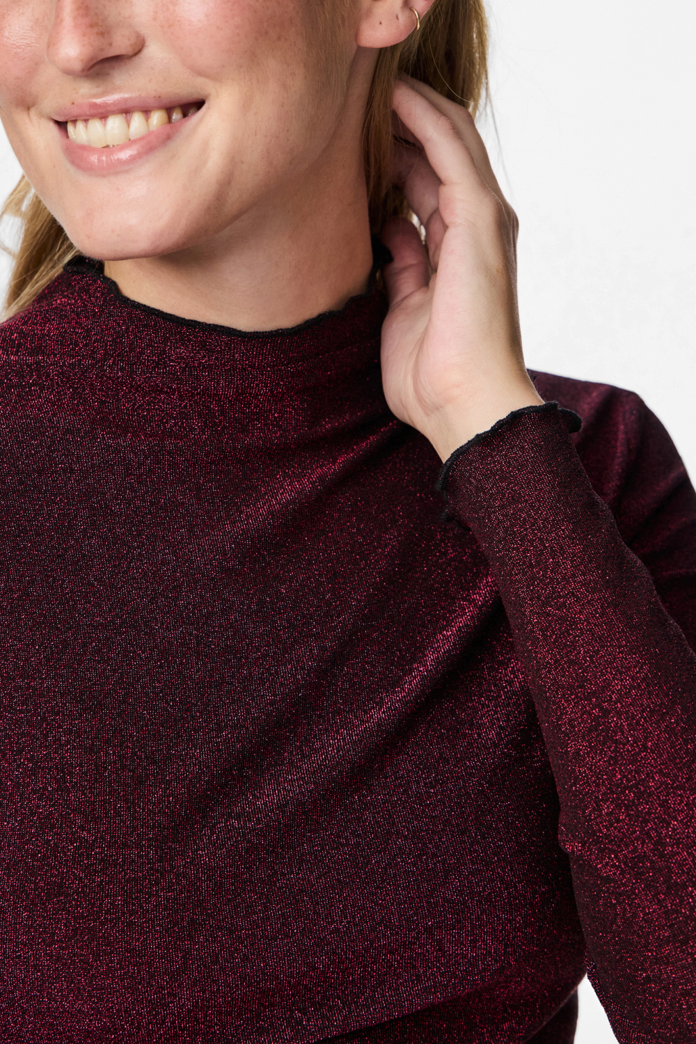 Dit trendy beetroot purple T-shirt van Pieces is een geweldige keuze voor jouw herfstgarderobe. De slim fit pasvorm in combinatie met de high neck en lange mouwen zorgen voor een stijlvolle uitstraling. Het T-shirt is verfraaid met subtiele glitters, gemaakt van een mix van nylon, metaalgaren en elastan, waardoor het niet alleen comfortabel, maar ook opvallend is. Dit T-shirt is ideaal voor allerlei casual gelegenheden, of je nu een dagje in de stad plant of een avondje uitgaat. De normale lengte maakt het gemakkelijk te combineren met zowel een stoere jeans als een elegante rok. Dankzij de rijke kleur en sprankelende details geef je elke outfit een moderne, speelse touch. Het is een veelzijdig stuk dat eenvoudig aan te passen is aan jouw persoonlijke stijl.