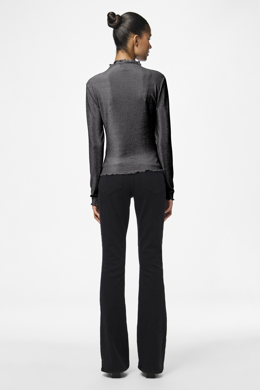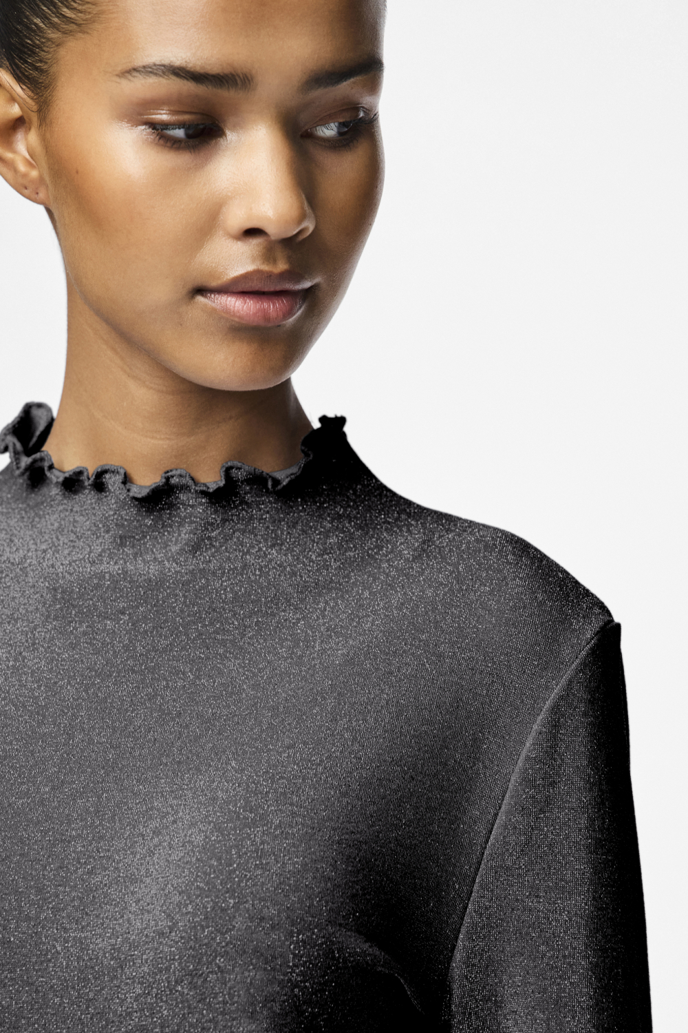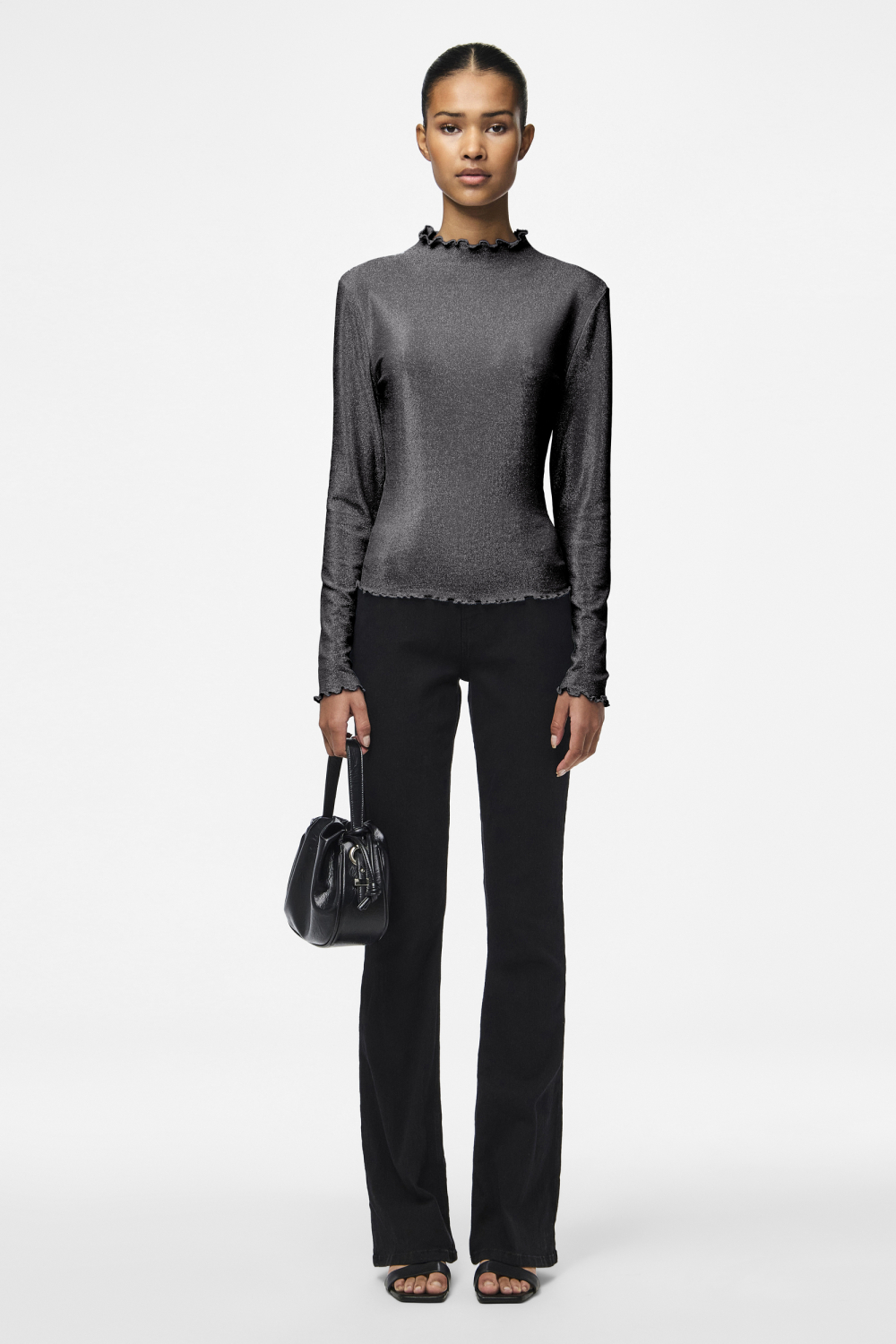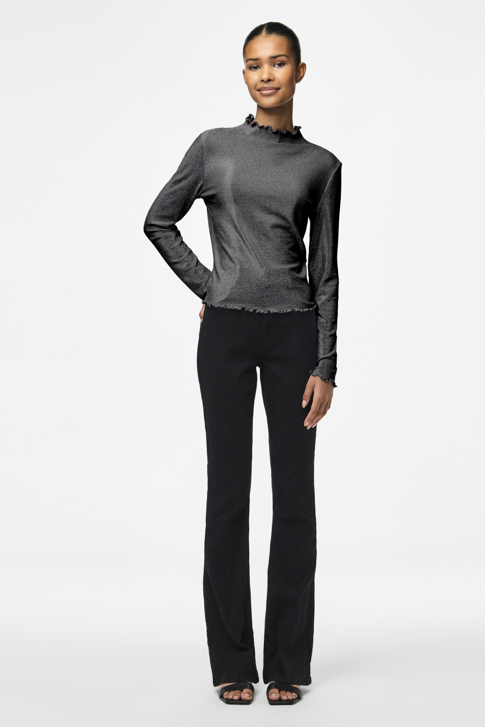 Dit elegante high neck T-shirt van Pieces in Black/Silver Lur is een prachtige aanvulling voor je herfstgarderobe. Het T-shirt heeft een subtiel glitterpatroon, wat een feestelijke uitstraling geeft zonder te overdrijven. Gemaakt van een mix van nylon, metaalgaren en elastan, voelt het comfortabel aan en beweegt het soepel met je mee. De regular fit en de normale lengte zorgen ervoor dat het T-shirt bij diverse lichaamstypes past. De lange mouwen maken het perfect voor koele avonden, en de speelse ruches aan de hals en mouwuiteinden geven een charmante twist.