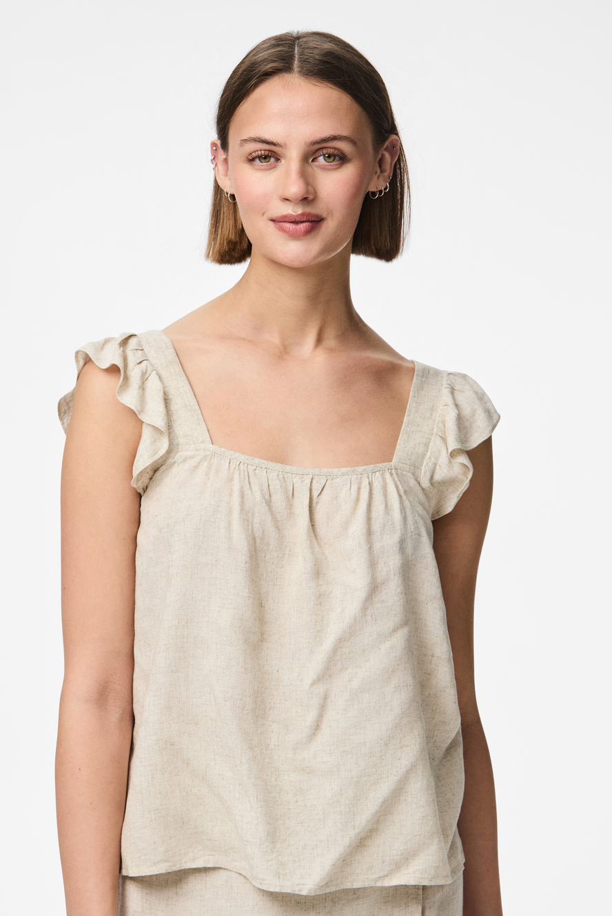 Deze casual top van Pieces biedt een stijlvolle en comfortabele toevoeging aan je garderobe. Gemaakt van 70% viscose en 30% linnen, is deze top een luchtige keuze voor elke dag. De beige tinten in het BIRCH/MELANGE patroon voegen een natuurlijke flair toe, terwijl de vierkante hals en speelse ruches zorgen voor een elegante uitstraling. De mouwloze pasvorm en normallange snit maken het een comfortabele keuze voor warme dagen. Dankzij het tijdloze ontwerp van deze Pieces top kun je makkelijk combineren met verschillende stijlen. Draag hem op een zomerse rok voor een ontspannen dagje uit of combineer met een nette broek voor een informele werkomgeving. Of je nu thuis bent of een dagje weg, met deze veelzijdige top zit je altijd goed. Voeg hem toe aan je seizoensfavorieten voor een moeiteloos stijlvolle look.