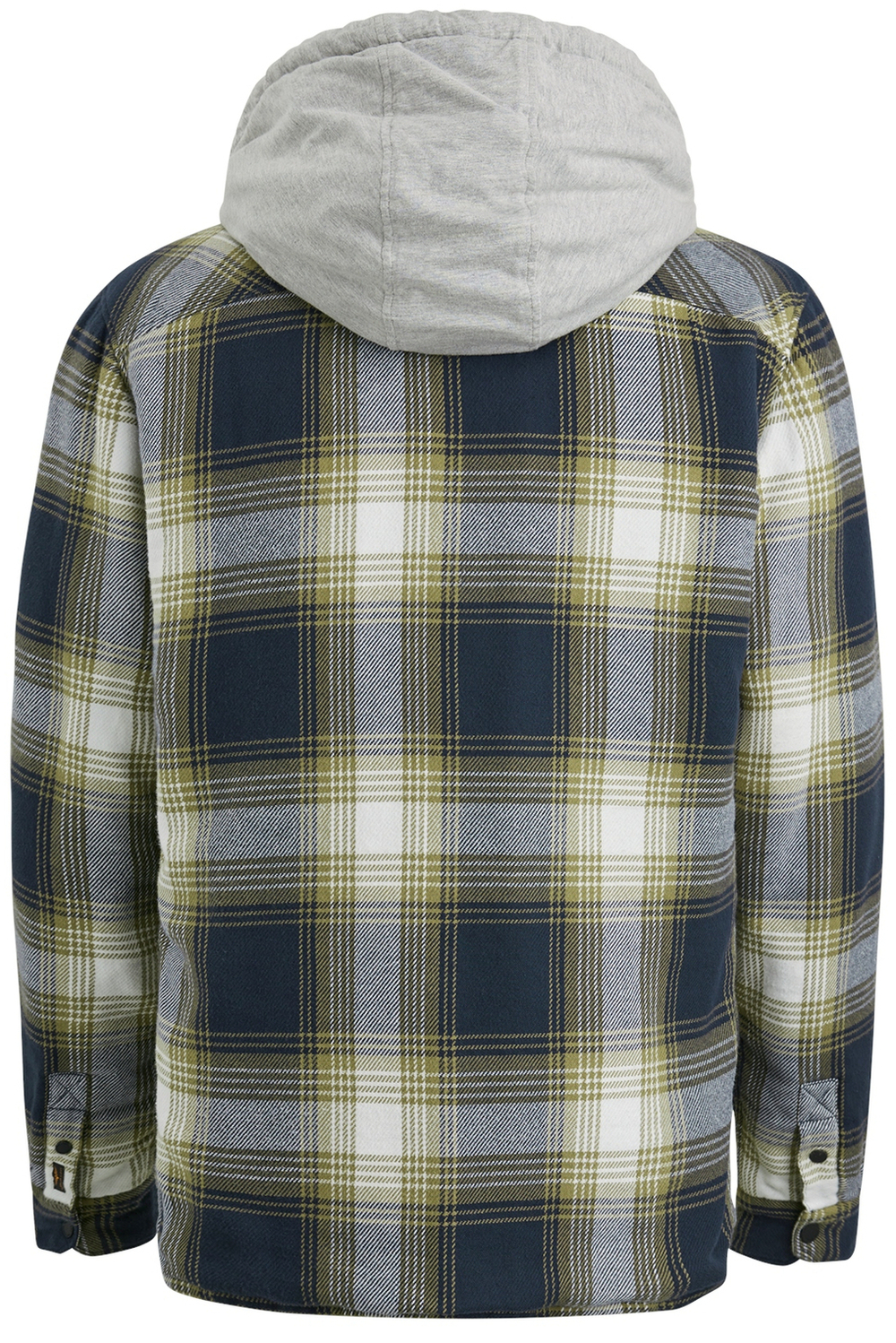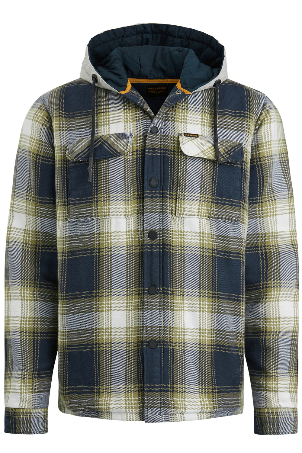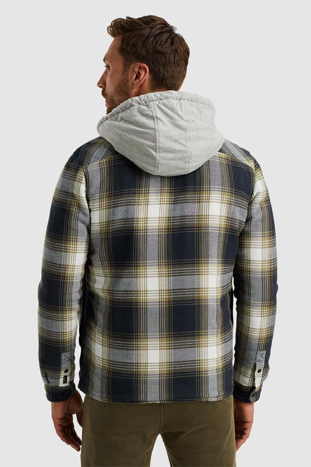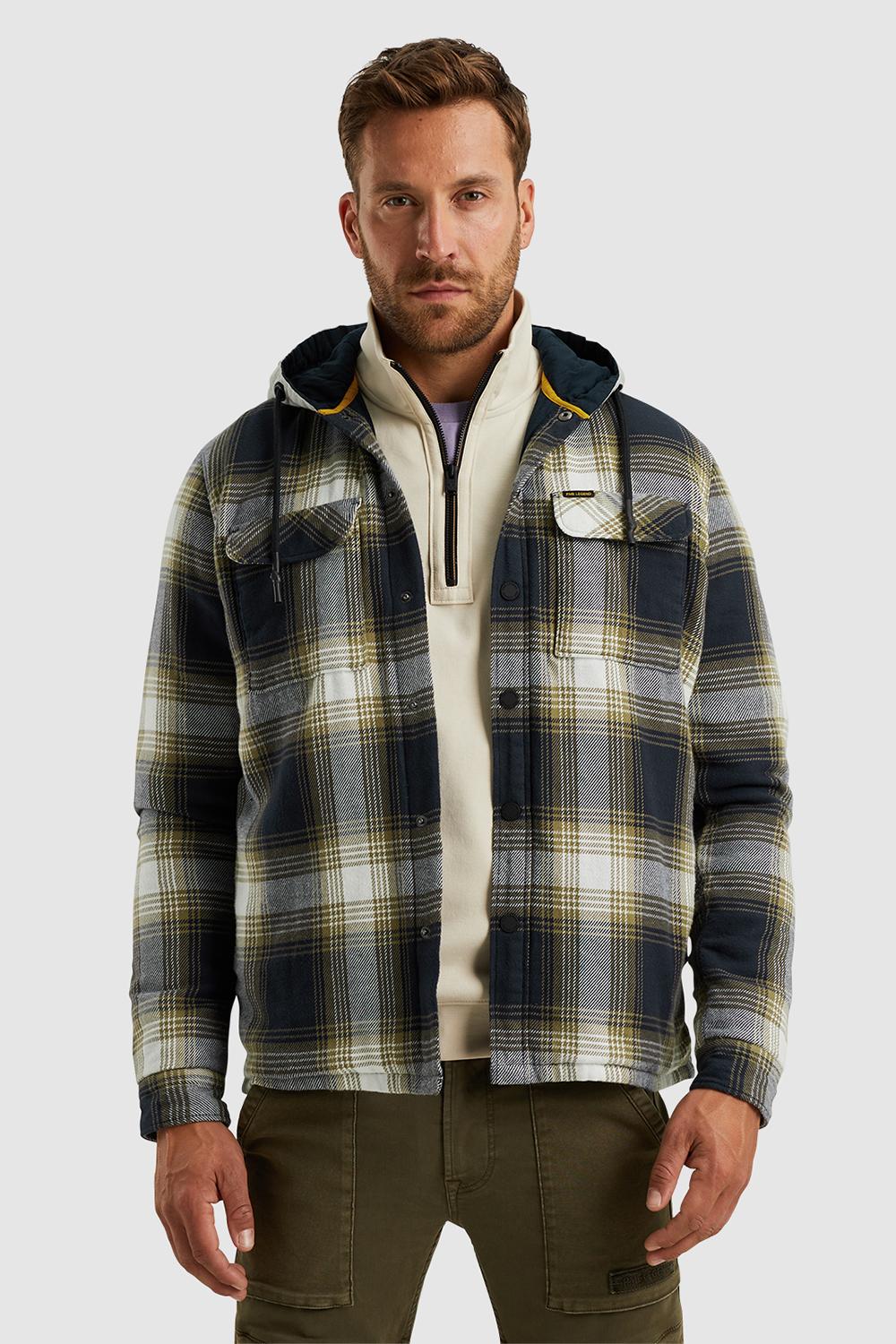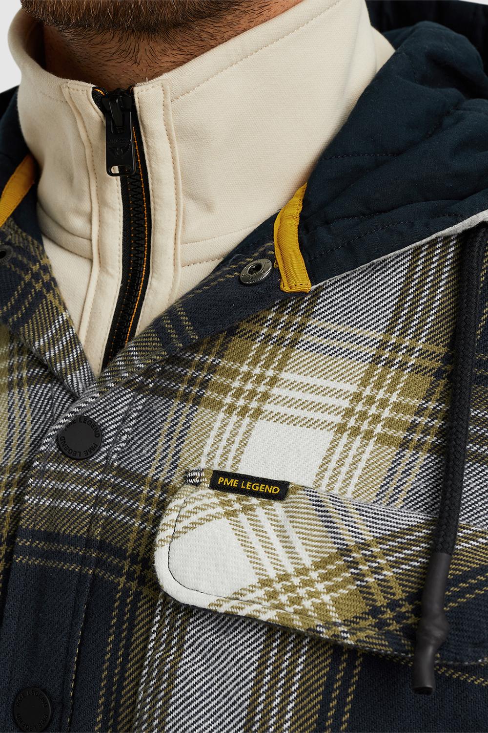 Overshirt van PME legend met lange mouwen en een vaste capuchon. Dit model heeft steekzakken aan de voorkant en klepzakken op borsthoogte. Het overhemd is allover geblokt en sluit met drukknopen.
