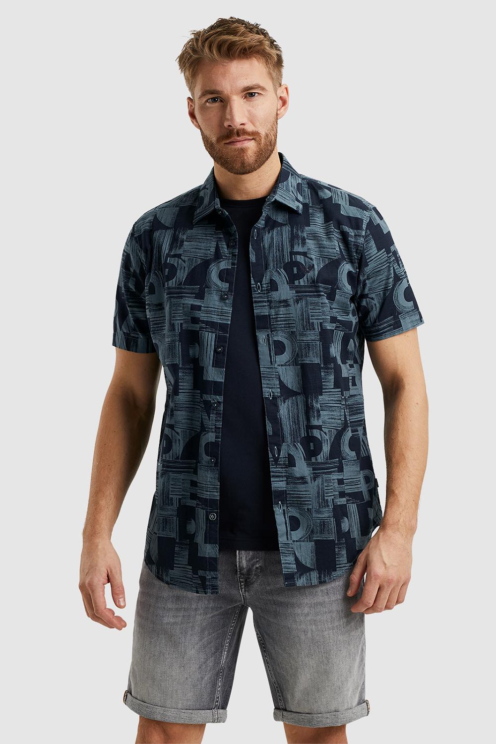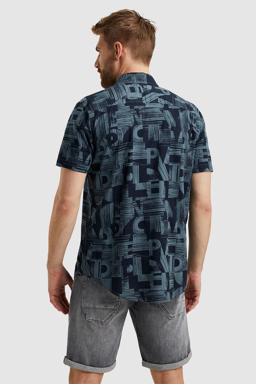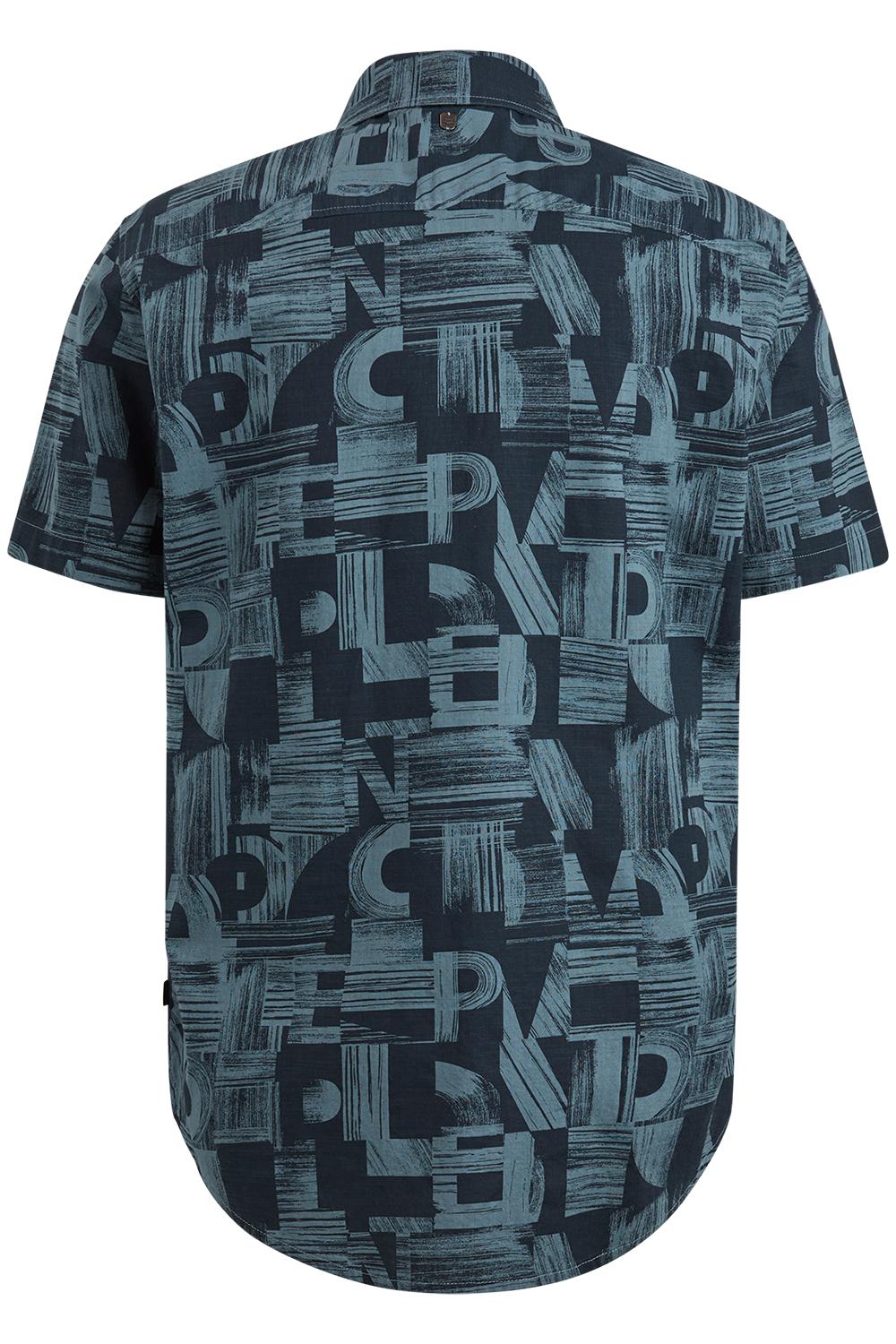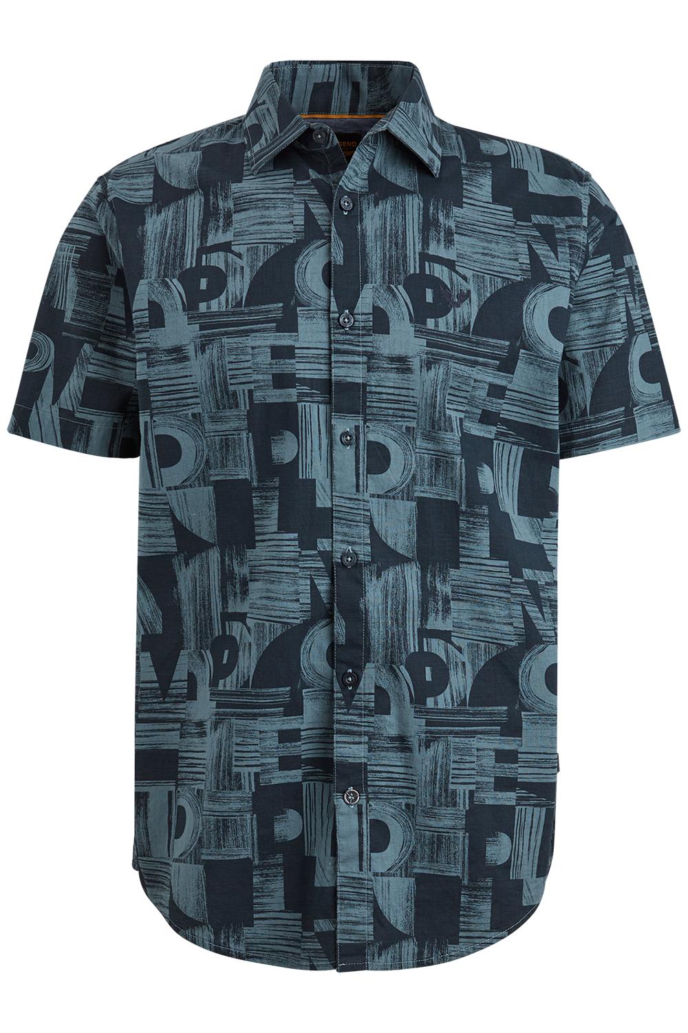 Luchtig overhemd van PME Legend met een allover patroon met letters. Dit model heeft een puntkraag en sluit met een rij knopen. Het overhemd heeft korte mouwen en op borsthoogte is het logo van PME Legend geborduurd.
