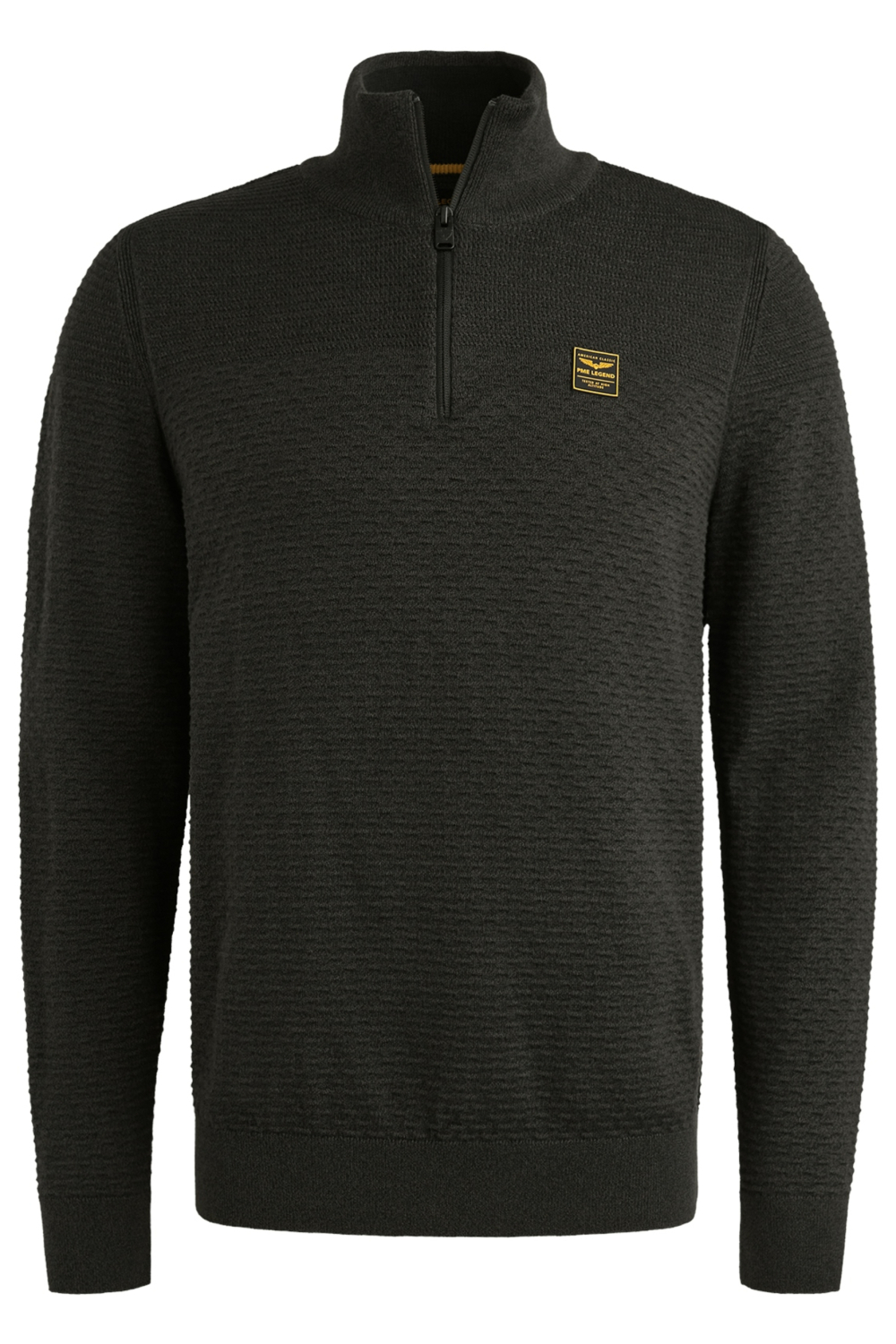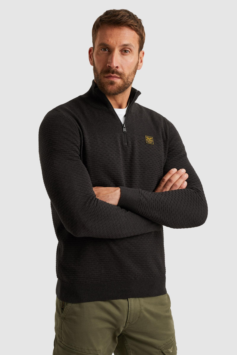 Deze comfortabele trui van PME Legend is een stijlvolle toevoeging aan je wintergarderobe. Gemaakt van 100% organisch katoen, biedt deze zwarte trui een soepele, ademende stof die heerlijk zacht aanvoelt. De trui heeft een regular fit en een fijn gebreid structuurpatroon dat het zowel een nette als casual uitstraling geeft. Met een handige rits en een high neck kraag, kun je zelf bepalen hoeveel warmte je wilt en hoe je het wilt dragen. Dankzij het tijdloze ontwerp is deze PME Legend trui perfect voor diverse gelegenheden. Combineer het met een nette broek voor een gepaste zakelijke look, of kies voor een relaxte jeans voor een weekendbijjeenkomst met vrienden. De lange mouwen en normale lengte zorgen voor een goede pasvorm en extra comfort in het koudere seizoen. Of je nu naar kantoor gaat of een avondwandeling maakt, deze trui is een betrouwbare keuze. Het subtiele PME Legend logo voegt een vleugje klasse toe zonder te overheersen.