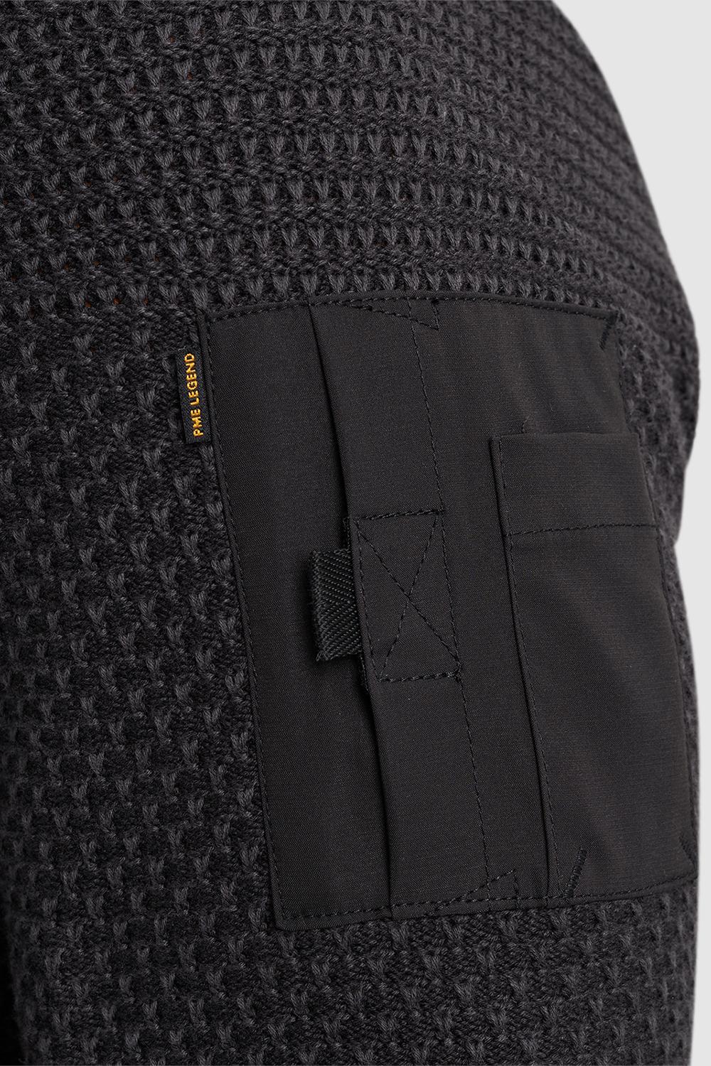 Gestructureerd vest van PME Legend. Dit item heeft lange mouwen en een highneckkraag. Het vest heeft een ritssluiting en steekzakken met drukknoop. Op borsthoogte is een rubberen embleem geplaatst.