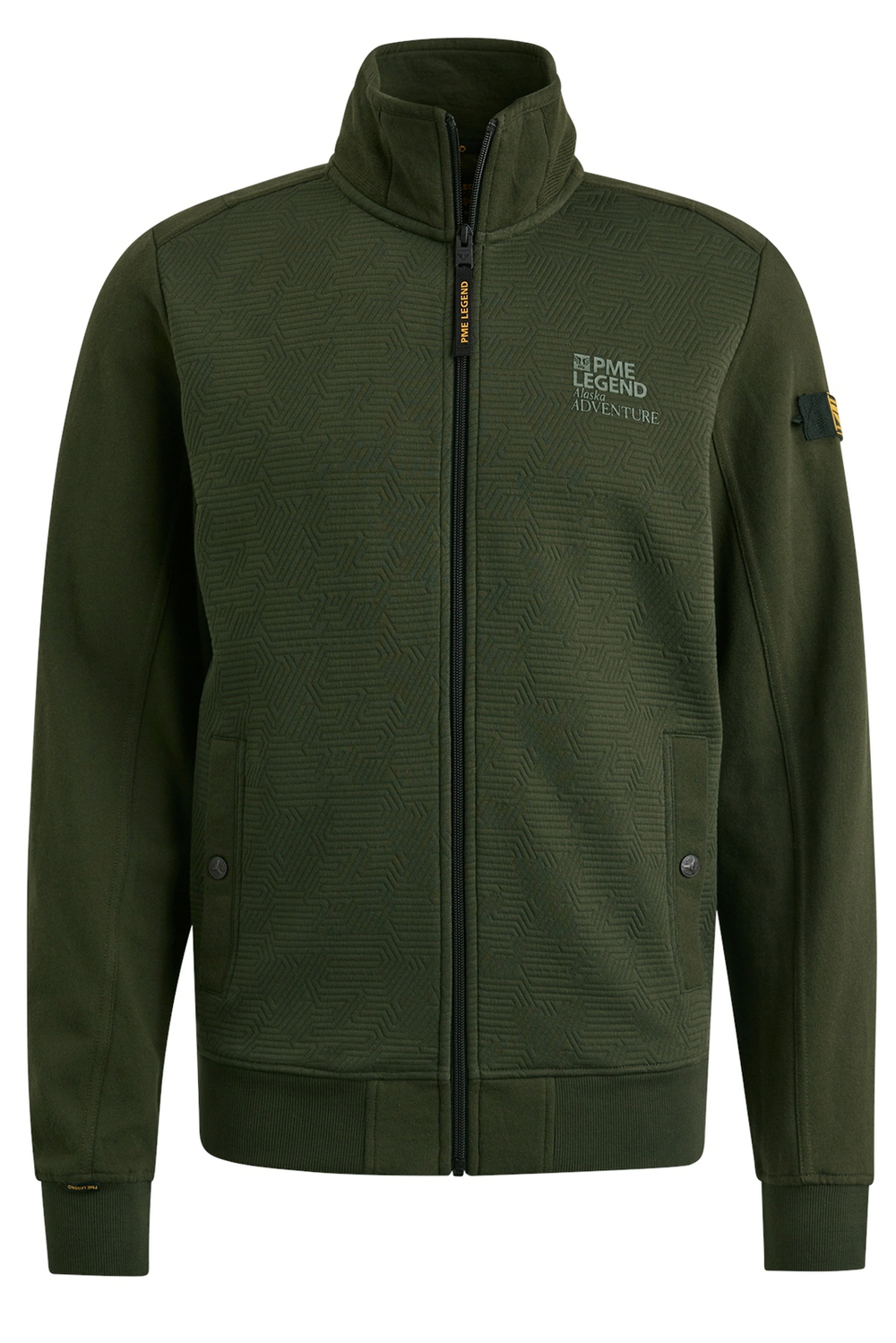 Gestructureerd vest van PME Legend met lange mouwen en een highneckkraag. Dit model heeft steekzakken aan de voorkant met drukknoopsluiting en is sluit met een rits.