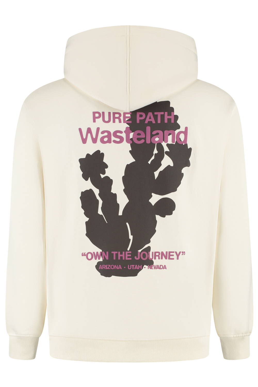 Deze casual sweater van Pure Path is een comfortabele aanvulling op je herfstgarderobe. De oversized pasvorm en de capuchon maken deze sweater perfect voor ontspannen dagen. Gemaakt van 100% katoen, biedt het niet alleen comfort, maar ook een duurzaam en ademend materiaal. Op de borst vind je een subtiele "Pure Path" print, terwijl de achterkant een opvallende grafische print heeft met de tekst "Wasteland" en silhouetten van cactussen. Dit detail geeft je look een unieke en artistieke flair. De sweater is ideaal voor dagelijkse casual gelegenheden, zoals een relaxte dag thuis of een informele bijeenkomst met vrienden. Combineer het bijvoorbeeld met een jeans voor een moeiteloze look. Dankzij de lange mouwen en normale lengte biedt het voldoende warmte en is het perfect voor het herfstseizoen. Of je nu in de stad bent of gewoon even een wandeling maakt, deze Pure Path sweater zorgt voor een stijlvolle en comfortabele uitstraling.