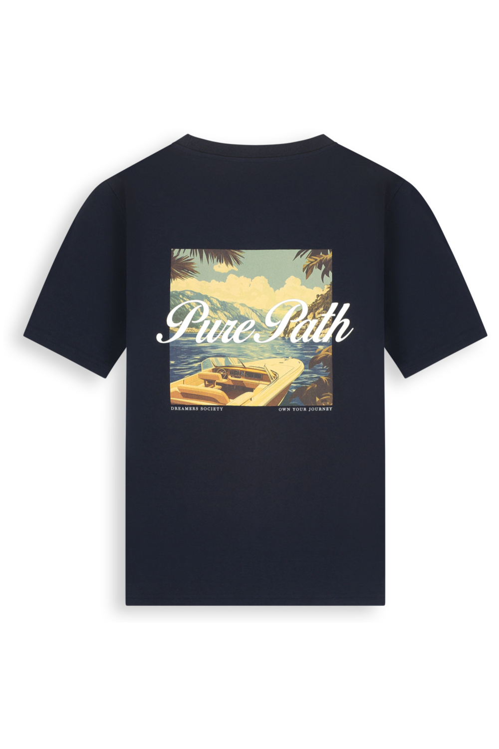 Het Pure Path T-shirt in 57 DARK NAVY is een stijlvolle keuze voor heren die houden van een casual uitstraling. Met een regular fit pasvorm en gemaakt van 100% katoen, biedt dit T-shirt optimaal comfort en draagbaarheid. De ronde hals zorgt voor een klassieke look die gemakkelijk te combineren is met andere kledingstukken. Op de achterkant vind je een opvallend grafisch printontwerp van een idyllisch landschap met een boot, wat dit shirt een uniek karakter geeft. Dit T-shirt is ideaal voor zowel informele als ontspannen gelegenheden, zoals een dagje uit of een middag in het park. Het tijdloze design en de korte mouwen maken het een veelzijdige keuze voor de lente. Draag het met je favoriete jeans of een relaxte korte broek voor een moeiteloze, casual stijl. Met het Pure Path T-shirt in je garderobe ben je altijd voorbereid op spontane avonturen.