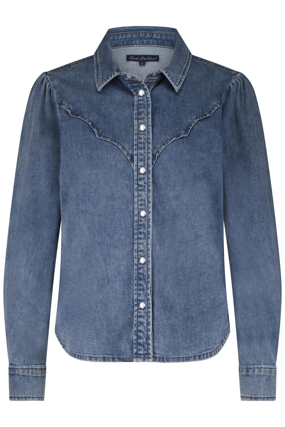 Deze Red Button damesblouse in denimstijl biedt een casual maar stijlvolle look voor de winter. Met een regular fit geeft de blouse een comfortabele pasvorm, ideaal voor dagelijks gebruik. De bleached wash zorgt voor een modieus effect, terwijl de opvallende drukknopen aan de voorkant het geheel een eigentijdse uitstraling geven. De puntkraag en de subtiele pofmouwen voegen een vleugje verfijning toe zonder te overdrijven. Gemaakt van een hoogwaardige mix van katoen, polyester en elastan, combineert deze blouse duurzaamheid met een aangenaam draagcomfort. De Red Button blouse is uitstekend te combineren met een casual jeans voor een alledaagse look, of maak het wat chiquer met een nette rok voor een werkdag of een diner. De normale lengte en lange mouwen maken het geschikt voor verschillende gelegenheden en seizoenen, waardoor je er veelzijdig mee kunt experimenteren. De mid stone kleur maakt deze blouse makkelijk te matchen met verschillende kleuren en stijlen in je garderobe, wat het een praktische keuze maakt voor iedereen die houdt van een stijlvolle en veelzijdige outfit.