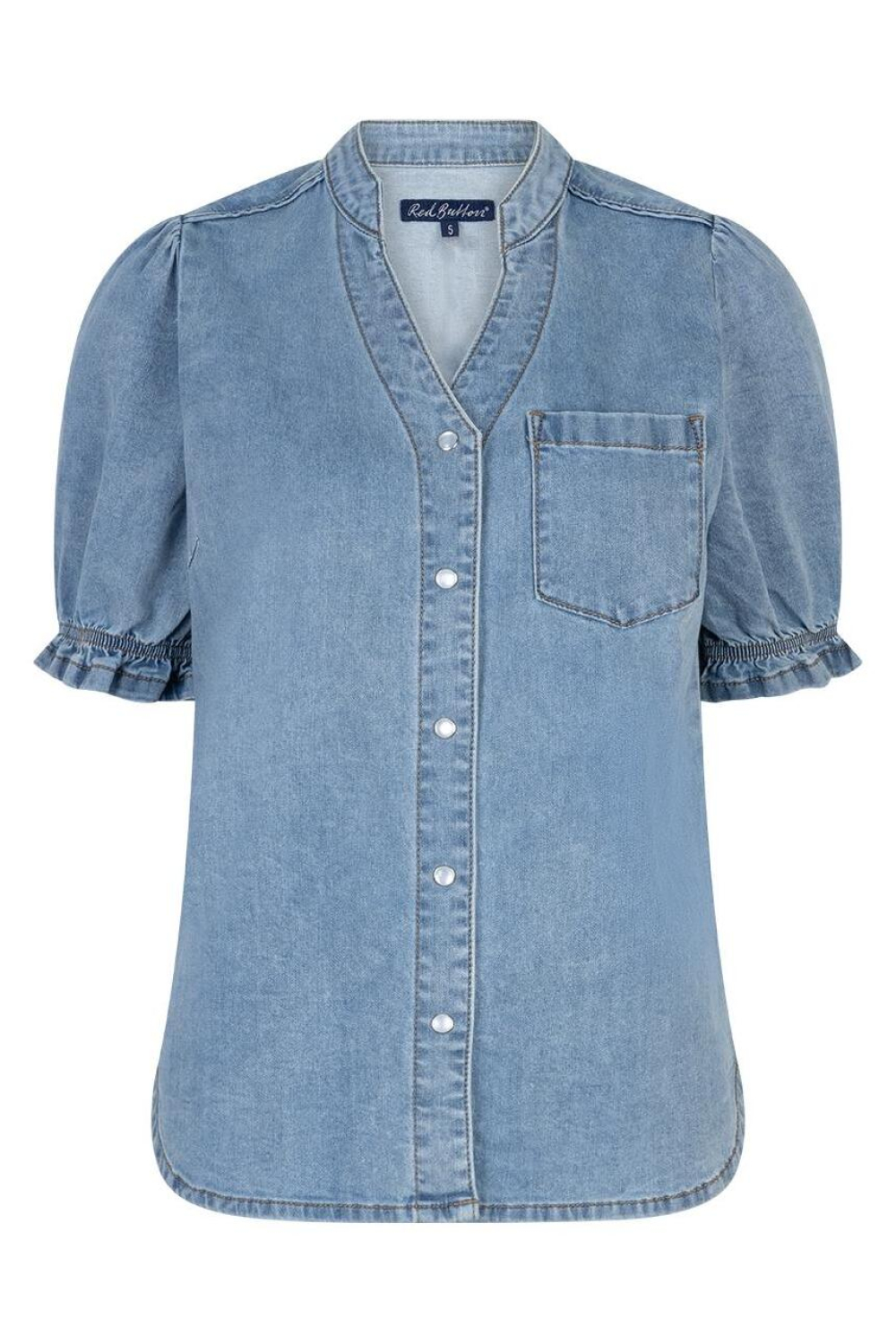 Deze stijlvolle denim blouse van Red Button is een veelzijdige aanvulling op je lente garderobe. Met zijn lichte blauwe kleur en verfijnde V-hals creëert deze blouse een frisse, casual uitstraling. De blouse heeft een regular pasvorm en is gemaakt van een comfortabele mix van 90% katoen, aangevuld met polyester en elastan, waardoor het een lichte stretch heeft. De drukknoopsluiting en de speelse borstzak voegen een subtiele, modieuze touch toe. Perfect voor informele gelegenheden of een dagje uit in de stad. De korte mouwen zijn voorzien van een elegante rimpeling en elastiek bij de zoom, wat bijdraagt aan het nonchalante, maar toch verzorgde design. Dankzij de normale lengte draag je deze blouse gemakkelijk op een jeans of rok, voor een moeiteloze lente-look. Of je nu op weg bent naar een lunch met vrienden of een ontspannen middag doorbrengt, deze blouse biedt je de perfecte balans tussen comfort en stijl. Het is een tijdloos kledingstuk dat eenvoudig te combineren is en je helpt om er op je best uit te zien.