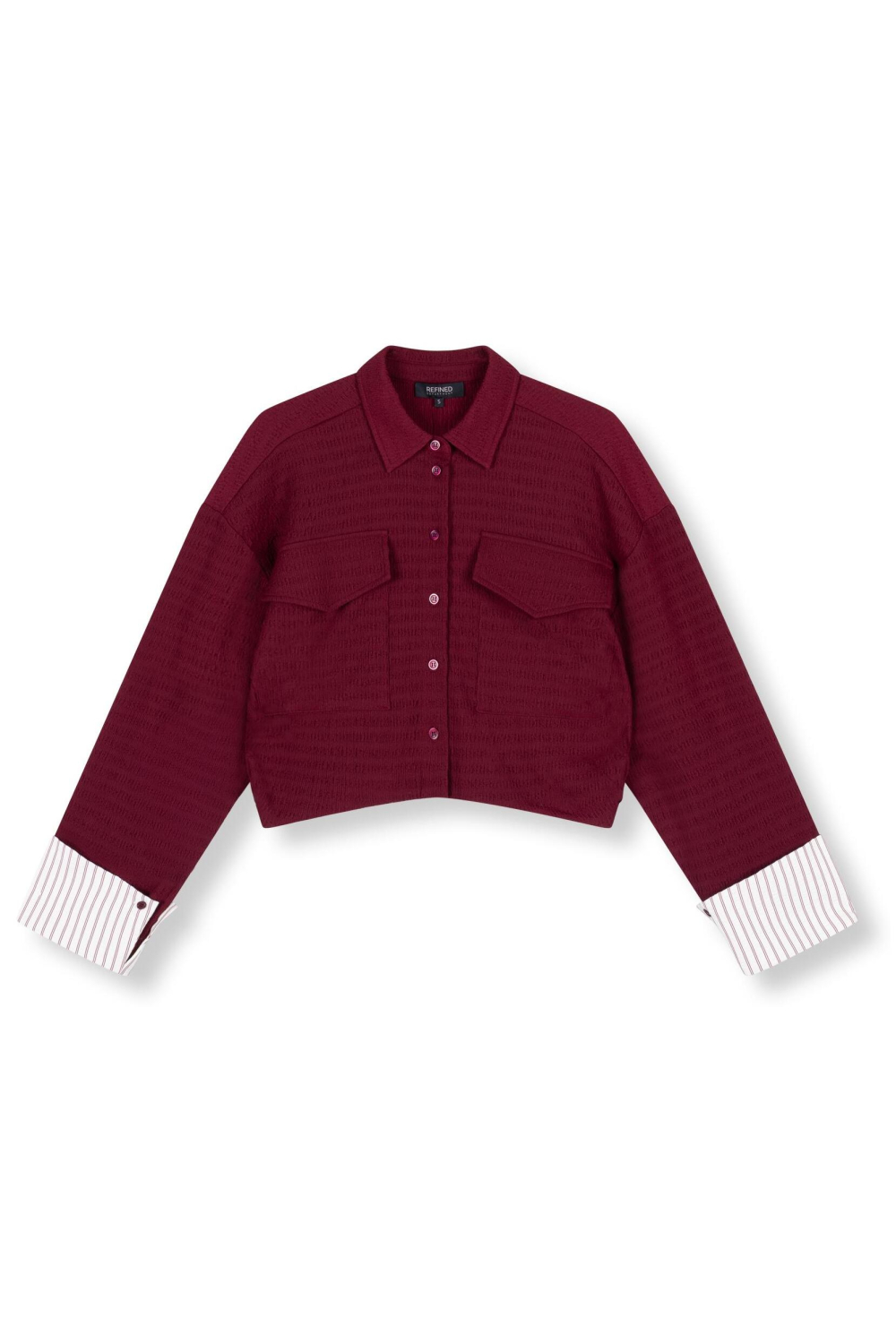 Deze bordeaux blouses van Refined Department zijn een perfecte keuze voor de herfst. Met een zachte structuur en klepzakken combineert de blouse stijl en functionaliteit. Gemaakt van 95% polyester en 5% elastan, voelt de stof soepel aan en biedt die net genoeg stretch voor extra comfort. De puntkraag en knoopsluiting geven het geheel een klassieke uitstraling, terwijl de relaxte fit zorgt voor een nonchalante look. Ideaal voor casual uitstapjes of een ontspannen dag op kantoor. De lange mouwen en de opvallende omgeslagen manchetten met streepdetails geven de blouse een eigentijdse twist. De korte lengte maakt het makkelijk om te combineren met hogere broeken of rokken. Deze Refined Department blouse is een veelzijdige toevoeging aan je kledingkast en past goed bij zowel een jeans als een elegante rok. Of je nu naar een lunch met vrienden gaat of gewoon een dagje de stad in trekt, met deze blouse zie je er altijd verzorgd uit.