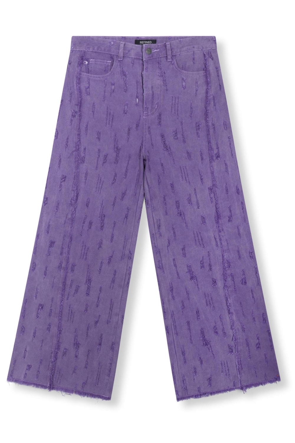 Deze paarse wide leg jeans van Refined Department is een opvallende keuze voor de lente. Dankzij de high waist en de bleached wash krijg je een modieuze look, terwijl de unieke structuur van de stof voor een speels en onderscheidend effect zorgt. De jeans heeft een klassieke 5-pocketstijl en een knoop- en ritssluiting, waardoor hij zowel praktisch als stijlvol is. Gemaakt van 100% katoen, biedt deze jeans comfort voor dagelijks gebruik. Dankzij de brede pijpen en de normale lengte is deze jeans perfect te combineren met zowel casual als meer formele bovenkleding. Draag hem tijdens een informele bijeenkomst met vrienden of kies voor een stijlvol jasje voor een verfijnde look op kantoor. De paarse tint zorgt voor een frisse en unieke uitstraling, waardoor je een statement maakt bij elke gelegenheid. Deze Refined Department jeans is een veelzijdige en stijlvolle aanwinst voor jouw garderobe.