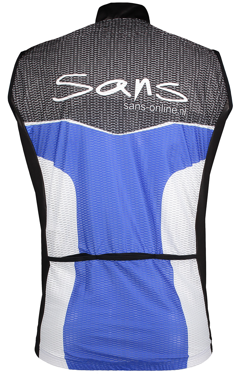 Uniseks Sans fietsjack van Bioracer met vergrendelbare heavy duty rits. Dit mouwloze jack met opstaande kraag heeft een winddicht voorpand en een airmesh ademend achterpand. Het achterpand heeft openingen ter hoogte van de achterzakken zodat deze gemakkelijk toegankelijk blijven.