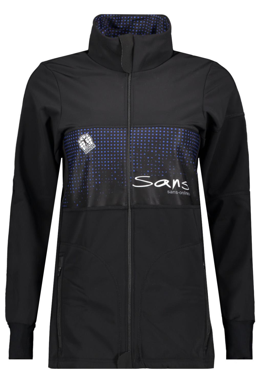 Softshell jas van Sans met lange mouwen en een hoge kraag. Deze fijne jas is voorzien van twee ritszakken aan de voorkant en het logo van Sans op voor en achterkant. Deze jas is perfect te dragen voor en na het sporten.