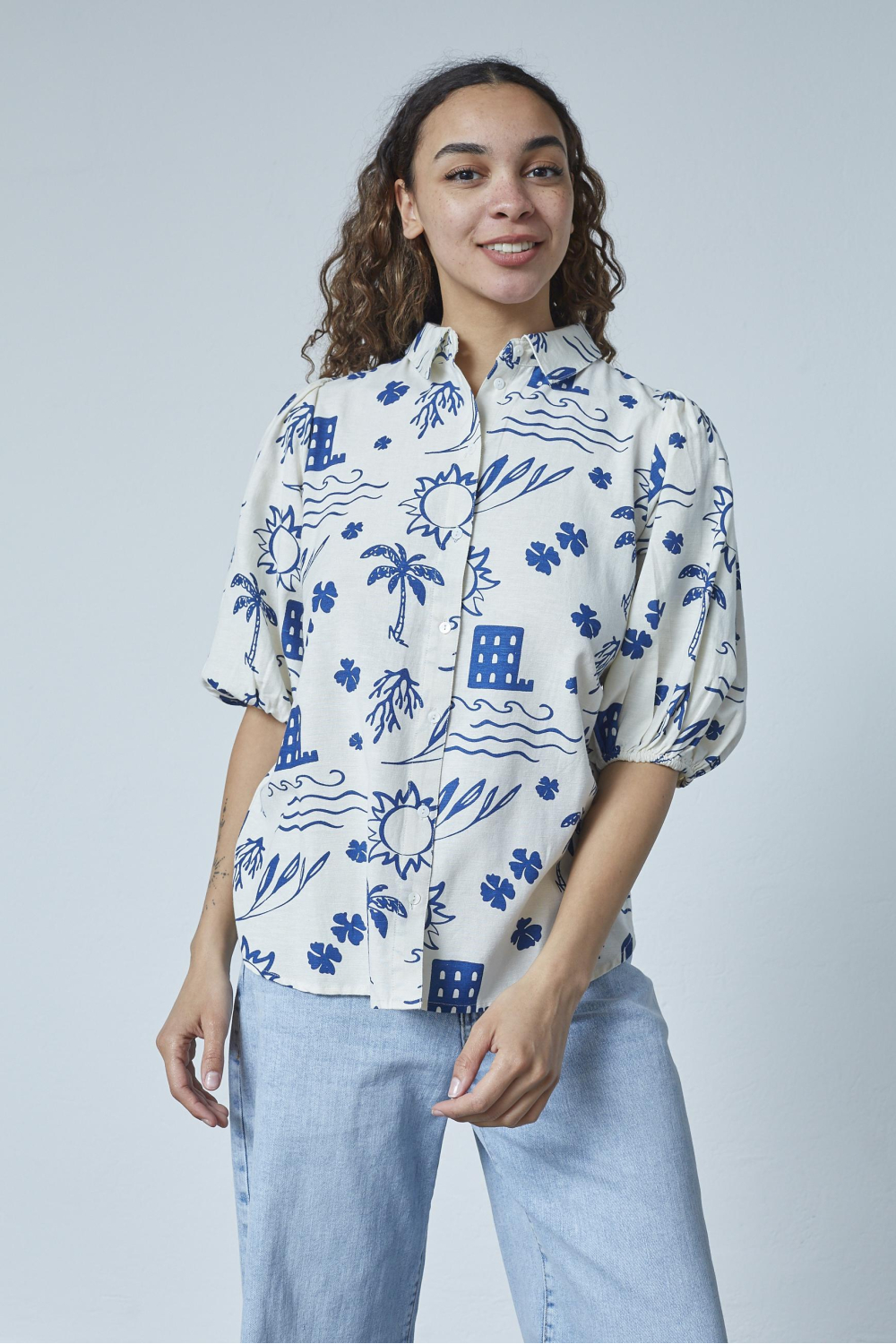 Deze casual blauwe blouse van SisterS point, in de kleur BEACH BLUE, is een stijlvolle aanvulling op je zomergarderobe. Met een opvallend grafisch patroon dat tropische vibes uitstraalt, biedt de blouse een frisse look voor zonnige dagen. De normale pasvorm en korte mouwen maken het tot een comfortabel stuk dat je moeiteloos combineert met zowel jeans als shorts. De fijne mix van 85% viscose en 15% linnen zorgt voor een lichte en ademende ervaring, ideaal voor lange zomerdagen. De blouse heeft een klassieke puntkraag en een knoopsluiting, wat bijdraagt aan een subtiel elegante uitstraling. Door de normale lengte is het een veelzijdig kledingstuk dat past bij casual uitstapjes, of een relaxte dag op het terras. Deze blauwe blouse van SisterS point maakt elke zomerdag net even leuker en authentieker. Combineer het met witte sneakers en een lichte tas voor een complete look. Geniet van de zomer met deze speelse en comfortabele blouse als jouw stijlvolle partner.