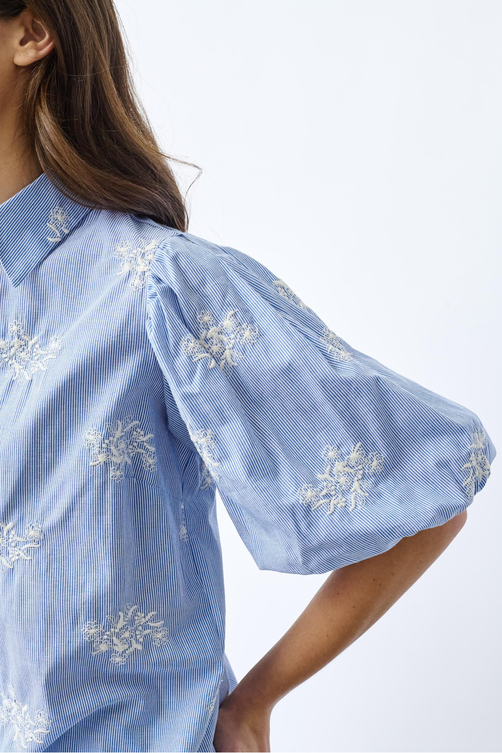 Deze casual damesblouse van SisterS point, uitgevoerd in de kleur Blue Stripe, brengt een vleugje frisheid naar je zomergarderobe. De blouse heeft een regular fit en is gemaakt van 100% katoen, wat zorgt voor een ademend en comfortabel gevoel. De subtiele streepjes in combinatie met het verfijnde geborduurde patroon geven de blouse een elegante uitstraling. De puntkraag en de korte mouwen met lichte pof zorgen voor een speelse twist, waardoor de blouse ideaal is voor zowel informele als iets formelere gelegenheden. Dankzij het tijdloze ontwerp kun je de blouse makkelijk combineren met verschillende kledingstukken. Draag de blouse bijvoorbeeld met een lichte spijkerbroek voor een ontspannen dagje uit, of combineer hem met een nette rok voor een zomerse kantoorlook. De knoopsluiting voegt een klassieke touch toe, terwijl de normale lengte zorgt voor een gemakkelijke en flatterende pasvorm. Deze blouse is een veelzijdige aanvulling op je garderobe en perfect voor iedere gelegenheid, van een zonnige dag in het park tot een diner met vrienden.