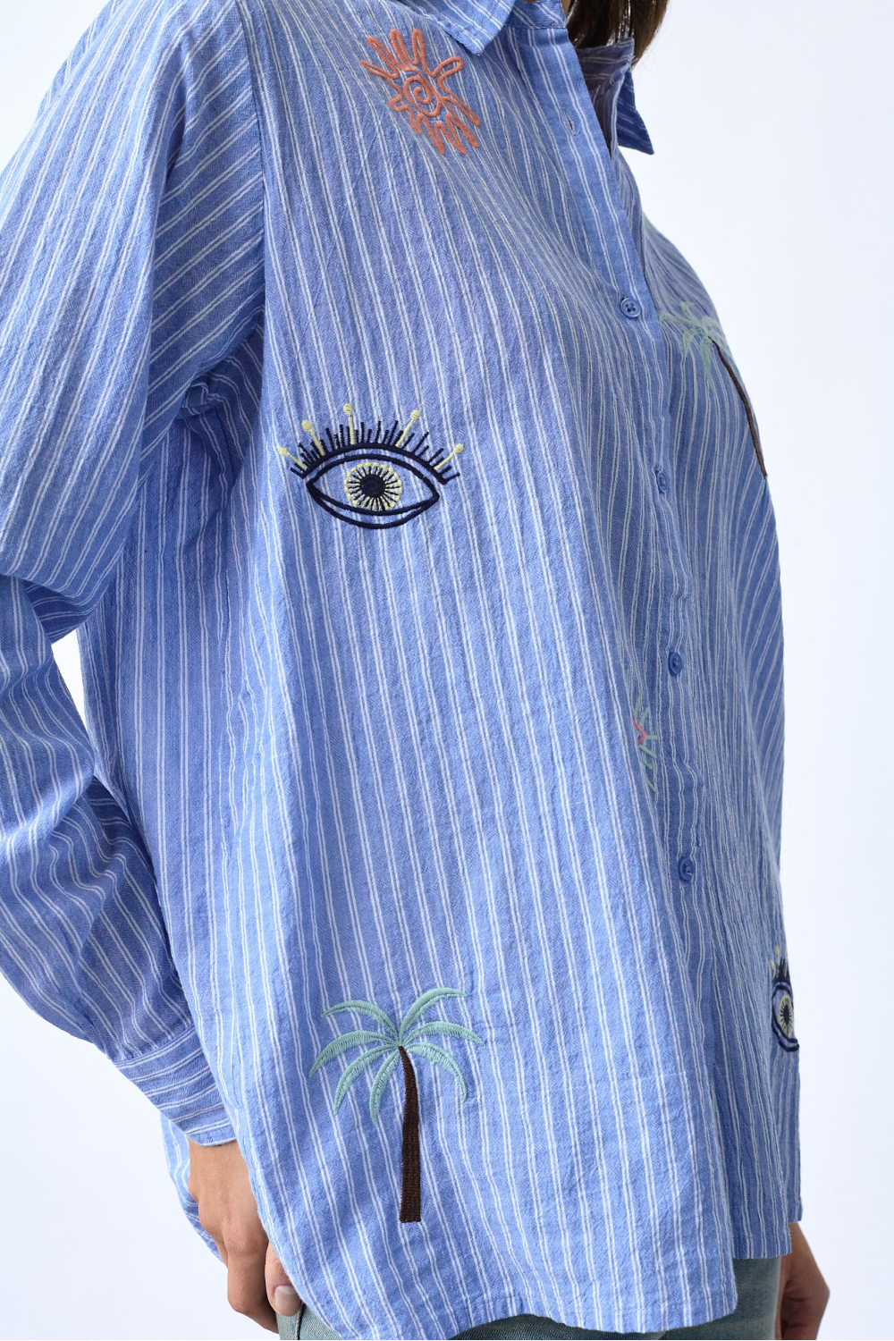 Deze blauwe gestreepte blouse van SisterS point is een verfijnde toevoeging aan je voorjaarsgarderobe. Gemaakt van 100% katoen, biedt deze blouse een heerlijk draagcomfort en een casual uitstraling. De regular fit en de klassieke puntkraag zorgen voor een moeiteloze pasvorm die geschikt is voor diverse gelegenheden. Verrijkt met speelse, geborduurde patronen zoals een oog en een palmboom, krijg je een blouse die zowel uniek als stijlvol is. Of je nu een dagje naar kantoor gaat of een informele lunch hebt, deze blouse is een uitstekende keuze. De lange mouwen en normale lengte maken het gemakkelijk te combineren met je favoriete jeans of een nette pantalon. Dankzij de knoopsluiting kun je de blouse zowel open als gesloten dragen, afhankelijk van je stijlvoorkeur. Met deze SisterS point blouse voeg je een opvallend en veelzijdig stuk toe aan je kledingcollectie.