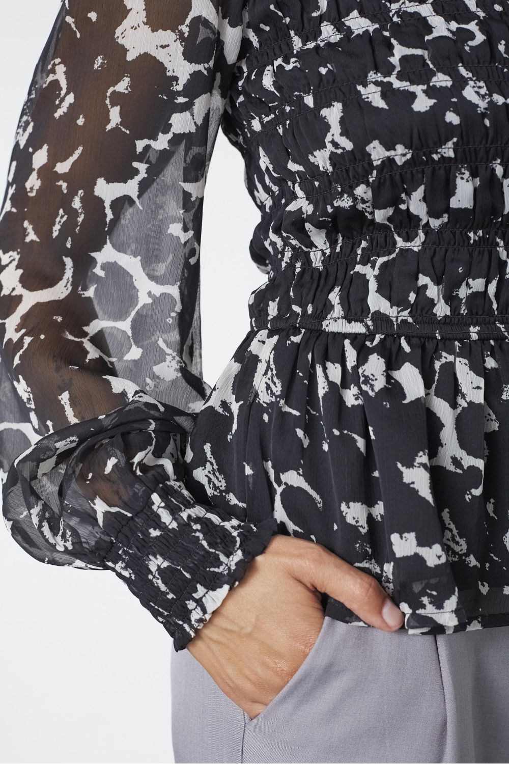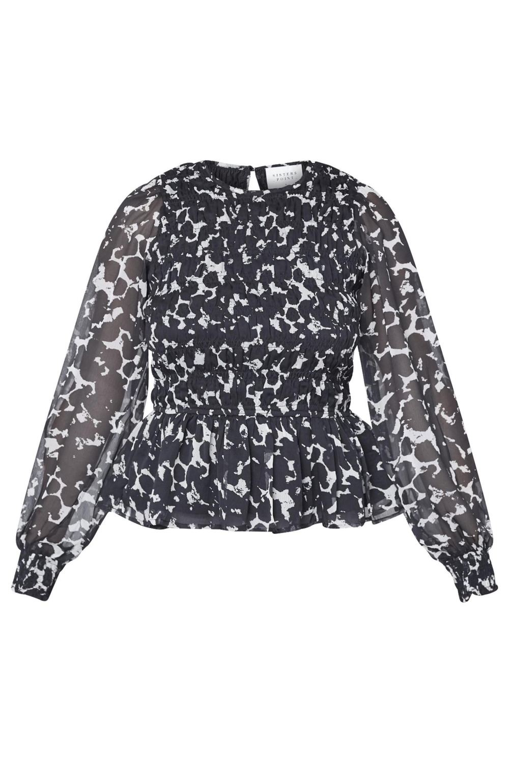 Deze elegante blouse van SisterS point is een verfijnde toevoeging aan je najaarsgarderobe. De blouse heeft een grafische zwart/witte print die een moderne uitstraling biedt, perfect voor diverse gelegenheden. Met zijn ronde hals en lange mouwen, biedt het zowel comfort als stijl. De blouse is vervaardigd uit 100% polyester, wat zorgt voor een luchtige en lichte pasvorm, terwijl de elastische band rond de taille een subtiele touch van elegantie toevoegt. Met de regular fit pas deze blouse comfortabel zonder in te boeten op stijl. De doorschijnende stoffering aan de mouwen geeft een speelse draai aan je outfit, ideaal voor zowel een zakelijke bijeenkomst als een casual dagje uit. De blouse kan moeiteloos gecombineerd worden met zowel een nette pantalon als een meer casual jeans. Door de klassieke knoopsluiting aan de achterkant blijft het ontwerp eenvoudig en stijlvol. Voeg deze blouse toe aan je collectie en geniet van een veelzijdig item dat je outfit elke keer compleet maakt.