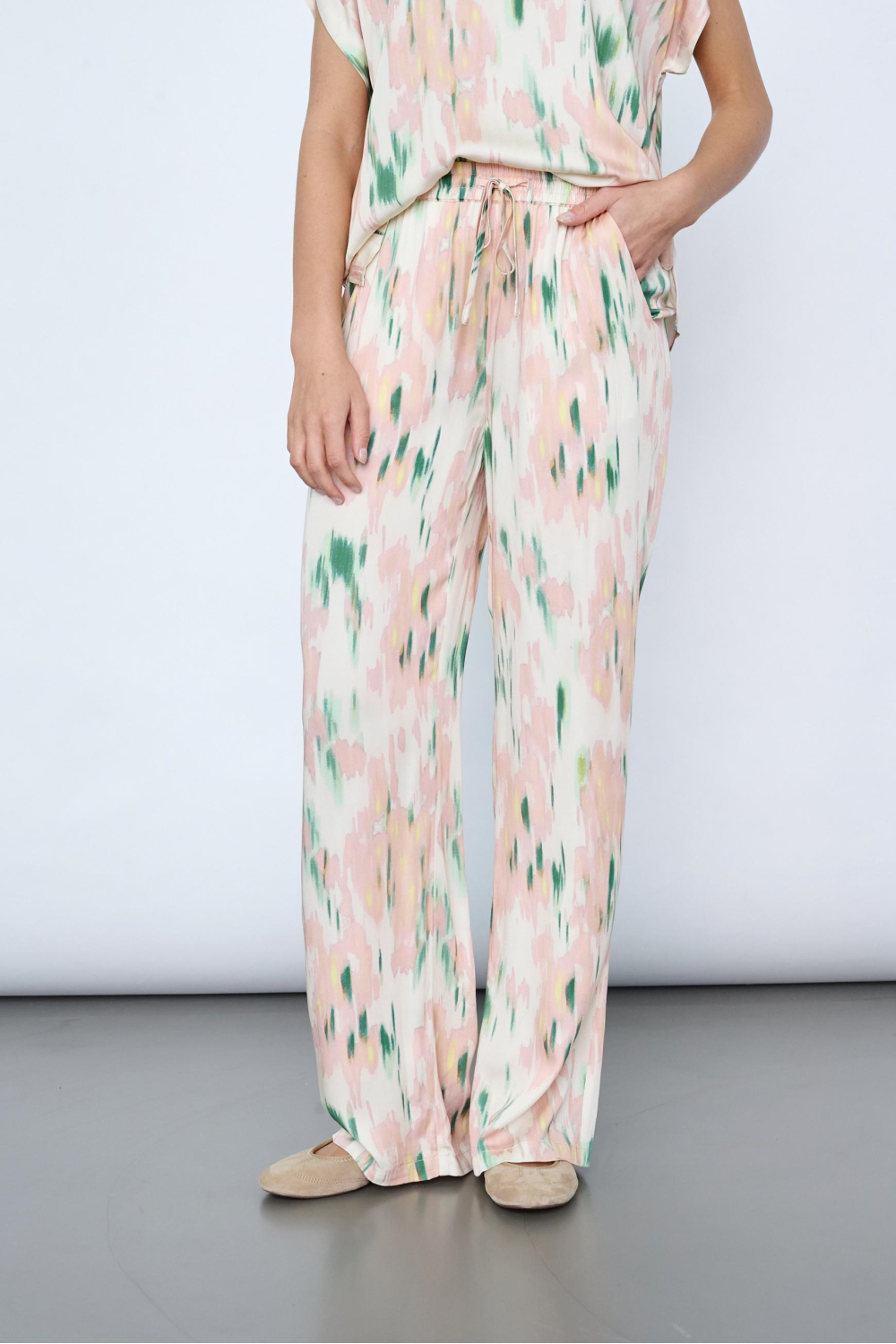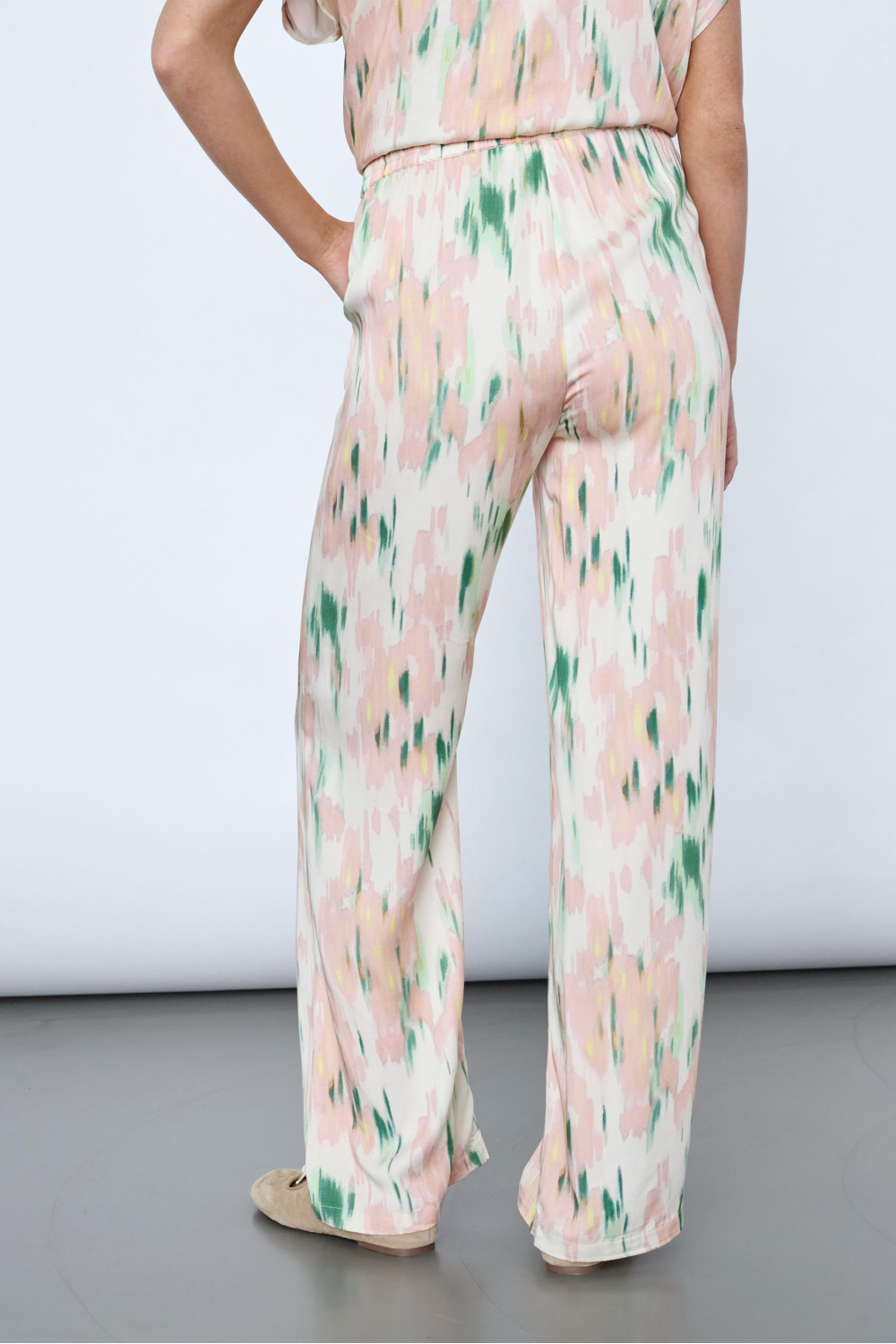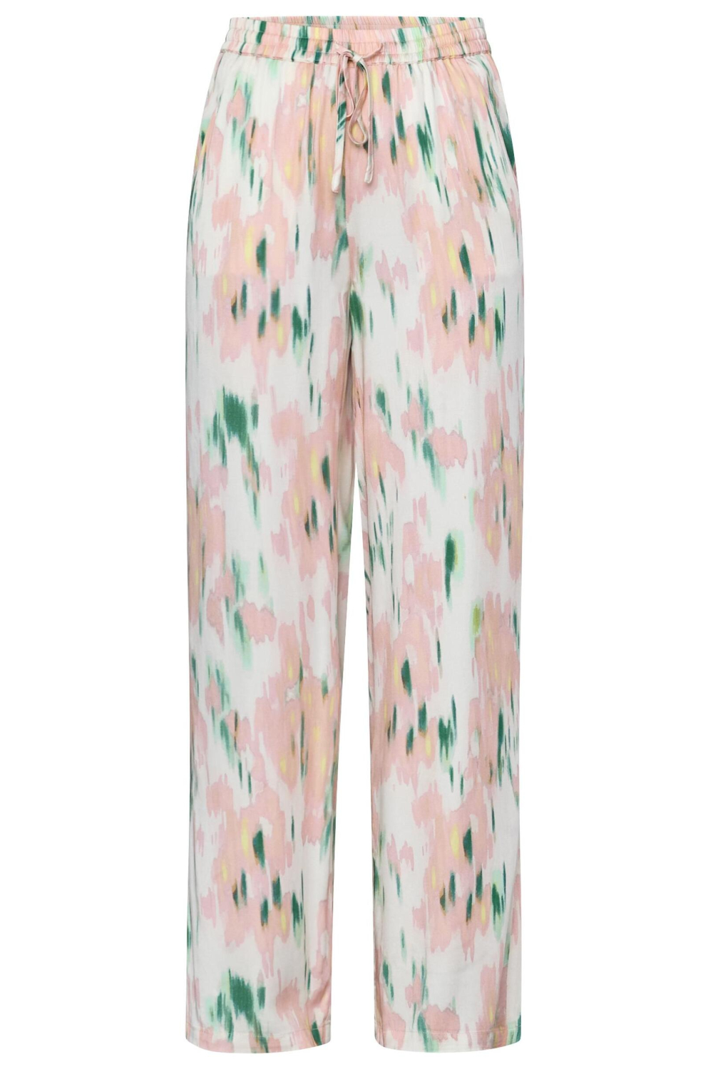 Deze grafische wide leg broek van SisterS point is een frisse toevoeging aan je zomergarderobe. Het zachte viscosemateriaal omhult je in comfort, terwijl het unieke patroon met subtiele groene en roze tinten een speels karakter toevoegt. Dankzij de elastische boord met trekkoord biedt de broek een flexibele pasvorm die ideaal is voor relaxte dagen of casual uitjes. De steekzakken zijn niet alleen praktisch, maar zorgen ook voor een nonchalante uitstraling. De SisterS point broek combineert moeiteloos stijl en gemak, wat hem een geweldige keuze maakt voor verschillende gelegenheden. Draag hem met een basic top en sandalen voor een dagje in het park, of kleed hem aan met een elegante blouse en hakken voor een zomerse avond uit. De normale lengte en regular waist zorgen voor een flatterende silhouet, waardoor je er in elke setting zelfverzekerd uitziet. Een veelzijdige broek die zowel comfortabel als stijlvol is.