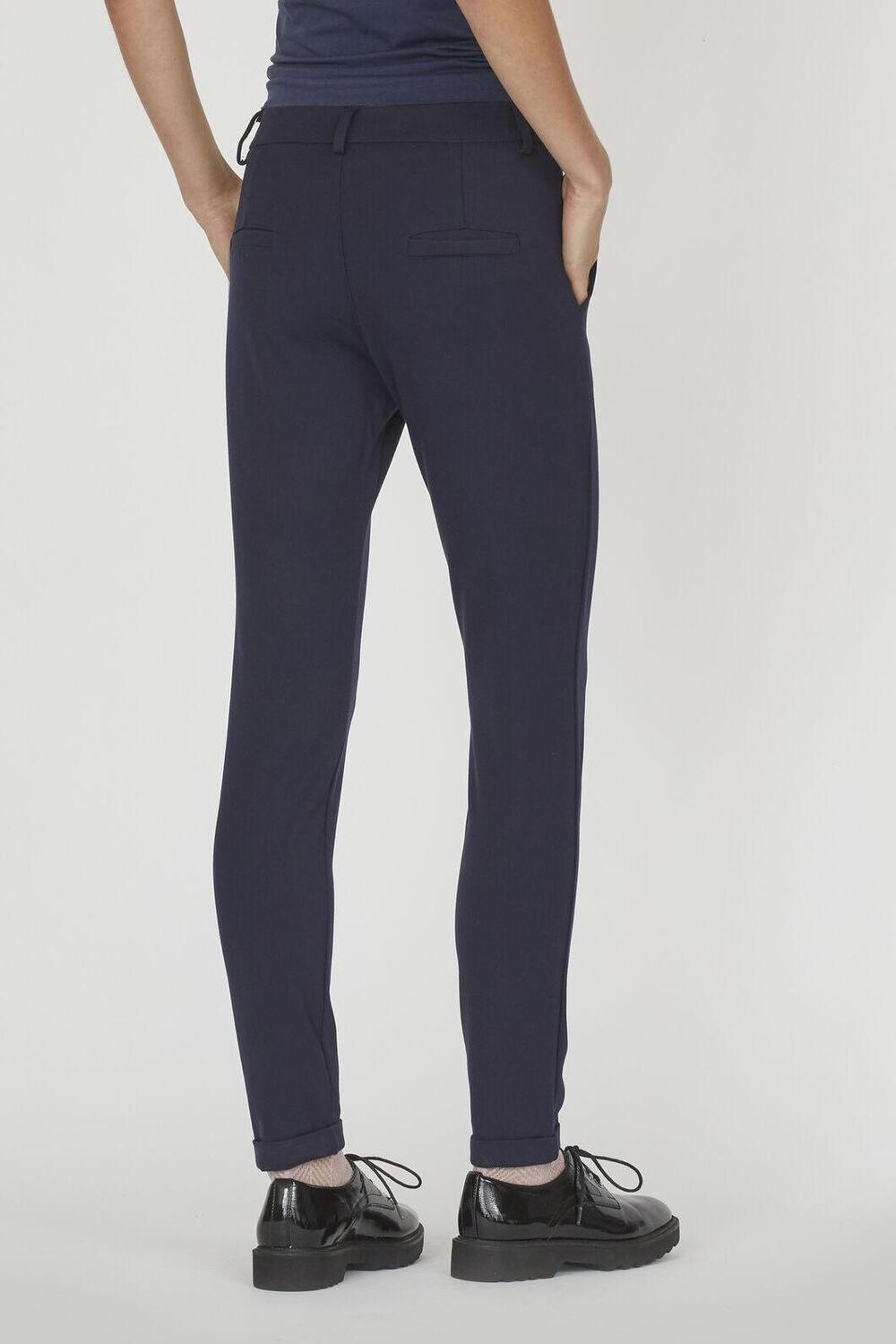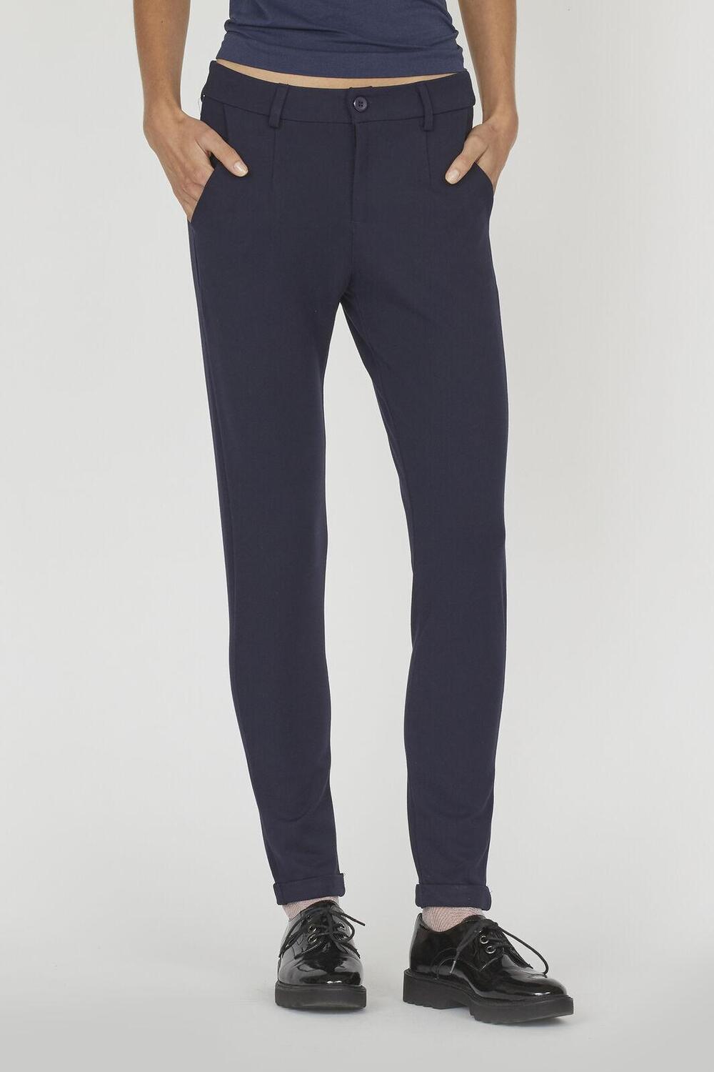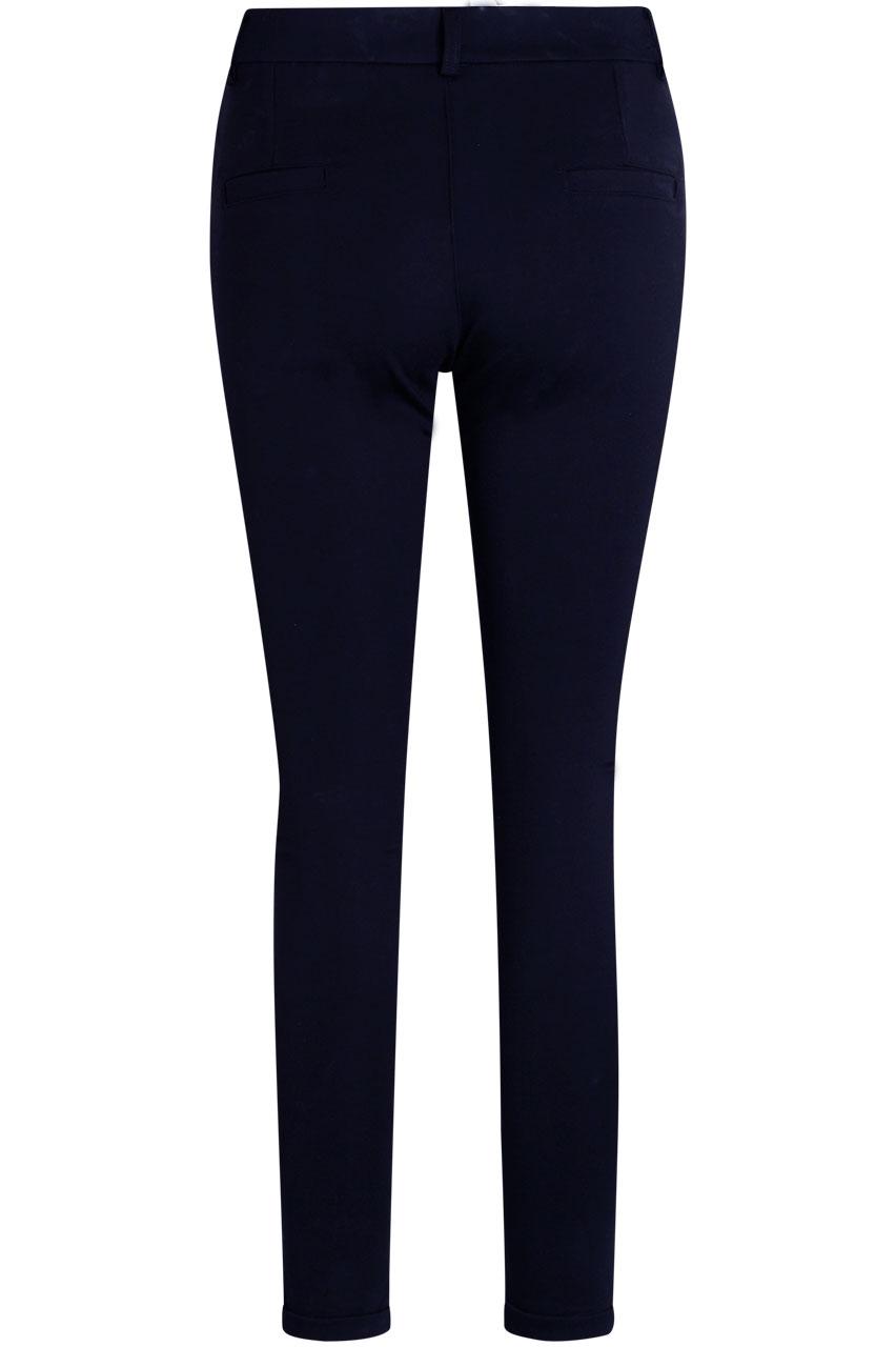 Slim fit broek van Sisters Point. Dit model sluit met een knoop,- rits combinatie en heeft twee steekzakken aan de voorkant. De stof is erg soepel en heeft daarom een hoog draagcomfort. De broek heeft een erg donkere kleur blauw.  De lengtemaat van deze pantalon zit tussen lengte 32 en 34 in.