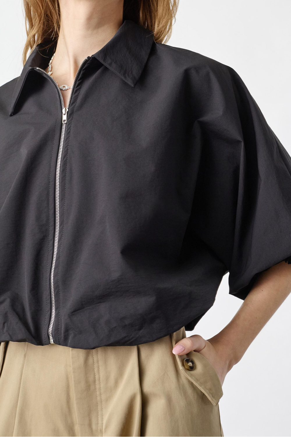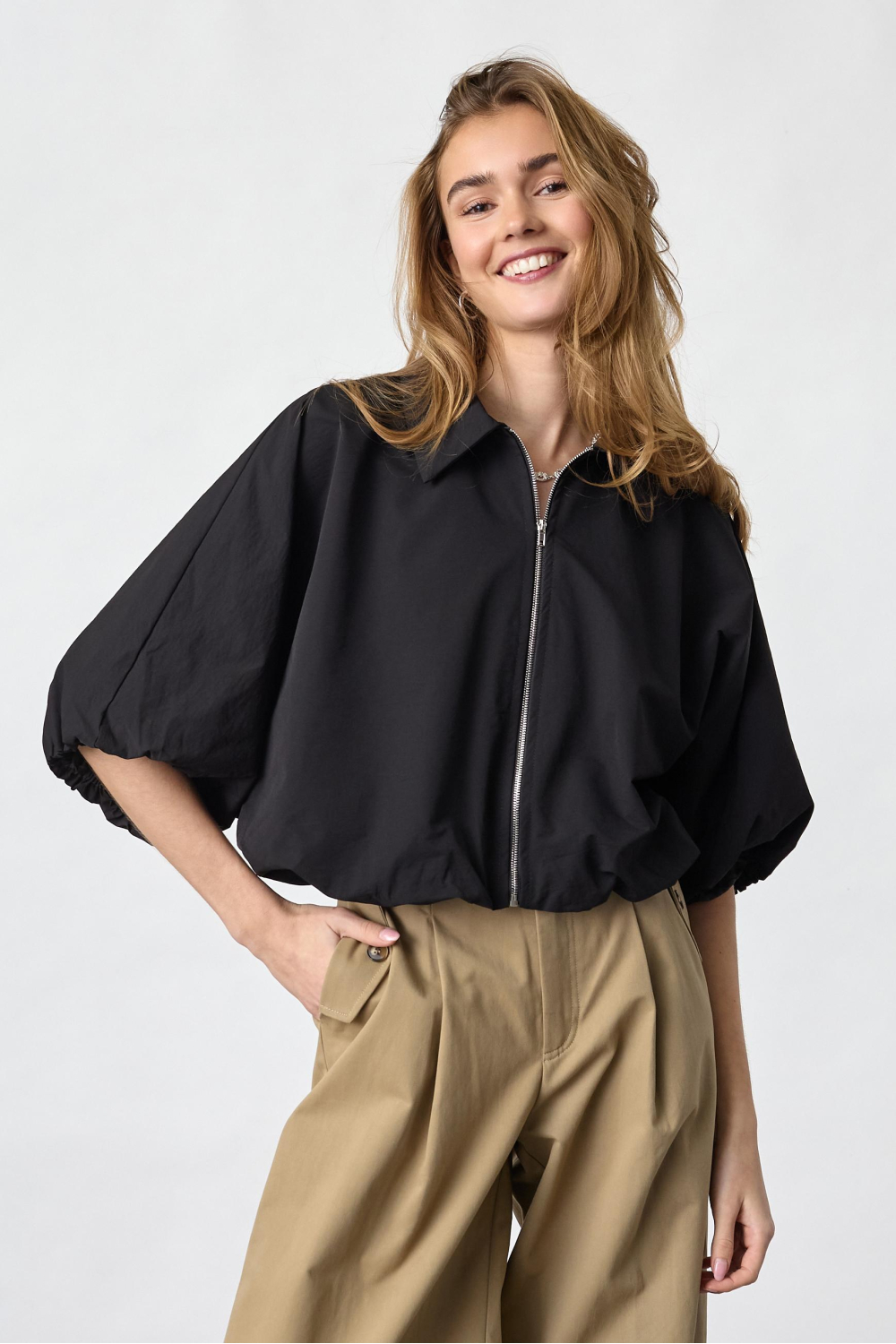 De zwarte zomerjas van SisterS Point is een stijlvolle keuze voor je casual zomeroutfits. Met zijn regular pasvorm en korte lengte zorgt deze jas voor een luchtige, moderne look. De jas is voorzien van een praktische ritssluiting en de klassieke puntkraag geeft een subtiele elegantie aan het geheel. De soepele 3/4 mouwen bieden extra comfort tijdens je dagelijkse activiteiten. Gemaakt van 100% polyester, is deze jas niet alleen licht, maar ook gemakkelijk te dragen op warmere dagen. Dankzij het tijdloze ontwerp past deze jas moeiteloos bij allerlei casual kledingstukken. Combineer hem met een lichte broek of een denim jeans voor een relaxte dag in de stad, of draag hem over een jurk voor een elegante touch tijdens een zomeravond. De zwarte kleur biedt veelzijdigheid en zorgt ervoor dat je met gemak verschillende looks kunt creëren. Deze jas is een perfecte metgezel voor elke zomerse gelegenheid waar je stijlvol voor de dag wilt komen. Meer informatie: De totale lengte is 45 cm bij maat S.