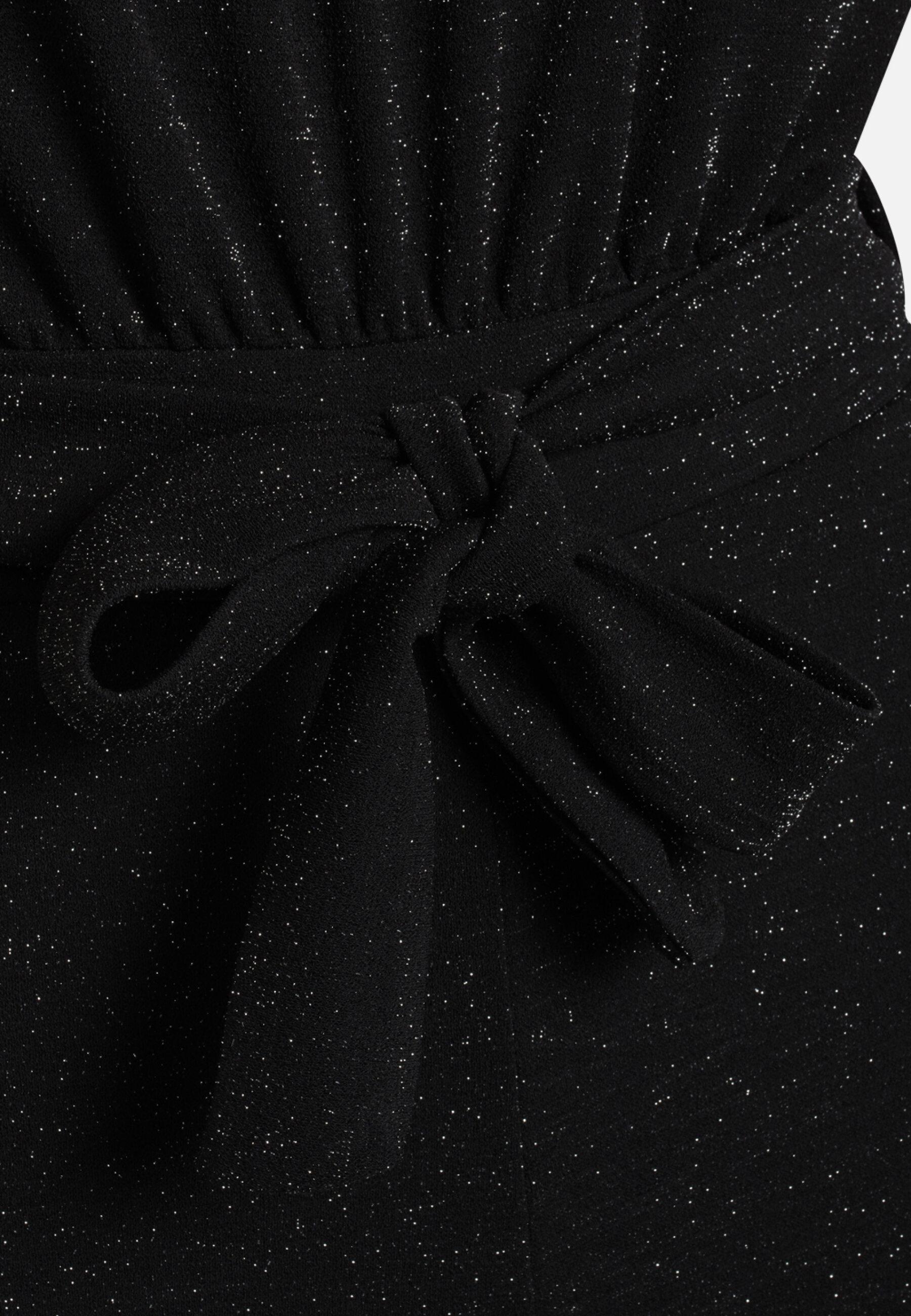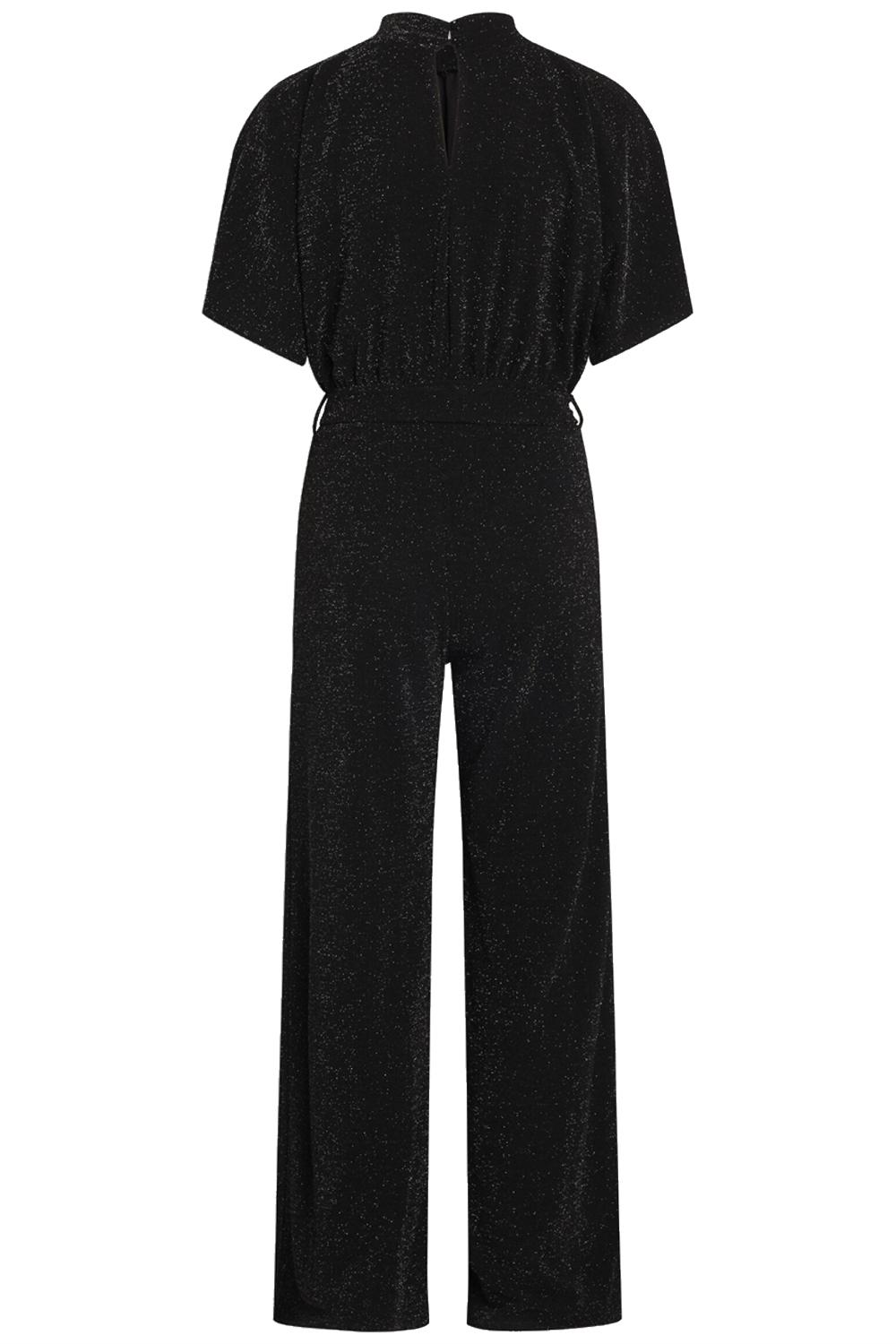 Feestelijke jumpsuit van SisterS Point met een zilverkleurige glitter. Dit model heeft korte mouwen en een opstaande kraag met knoopjes in de nek. Rond de taille heeft de jumpsuit een bijpassend ceintuur om deze te accentueren.