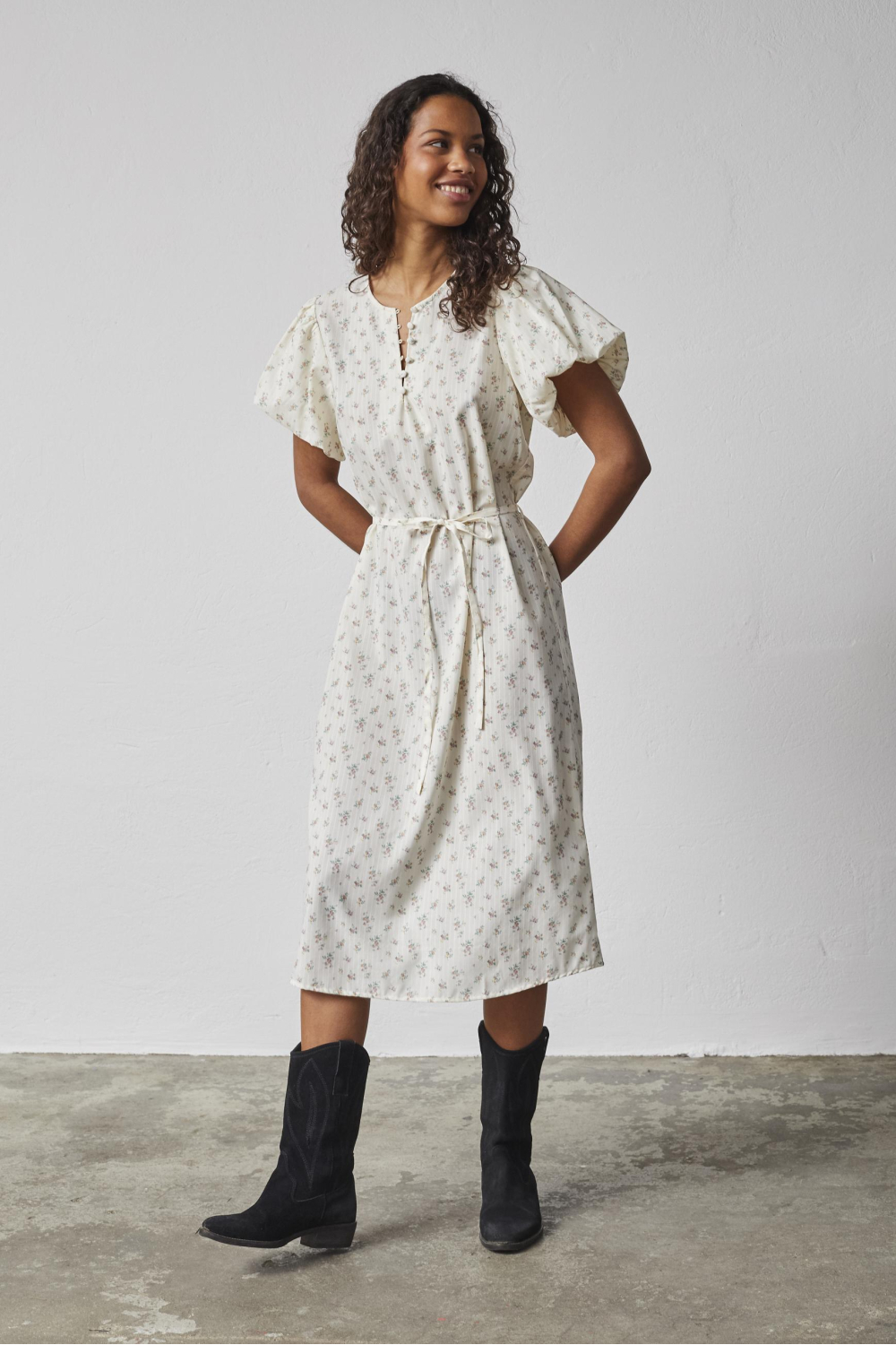 Deze elegante zomerjurk van SisterS Point is een mooie toevoeging aan je garderobe. Met een subtiel bloemenpatroon in lichte tinten, brengt de jurk een frisse en vrouwelijke uitstraling naar voren. De regular fit zorgt voor een comfortabele pasvorm, terwijl de ronde halslijn en knoopsluiting een stijlvolle finishing touch geven. Gemaakt van 65% viscose en 35% polyester, biedt deze jurk een luchtige en zachte sensatie, ideaal voor warme dagen. De jurk valt tot 7/8 lengte, waardoor hij zowel casual als elegant gedragen kan worden. Een mooie strik in de taille benadrukt je figuur op een subtiele manier. Perfect voor een zomerse dag in het park of een ontspannen middag op het terras. Combineer deze jurk met sandalen voor een casual look of met hakken voor een meer formele gelegenheid. De veelzijdigheid maakt het een echte aanwinst voor elke dame die houdt van een moeiteloze en stijlvolle uitstraling. Meer informatie: Totale lengte is 113 cm bij maat S.