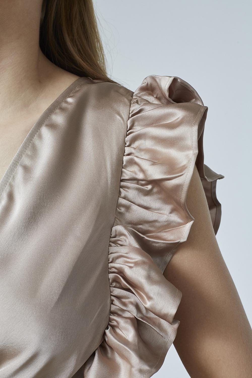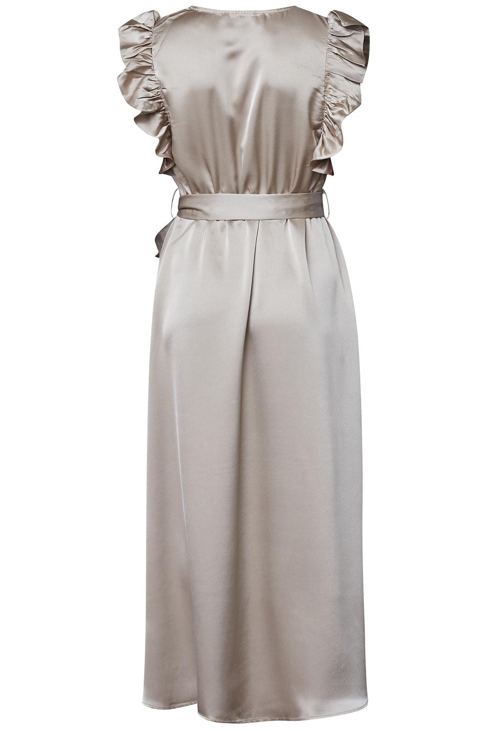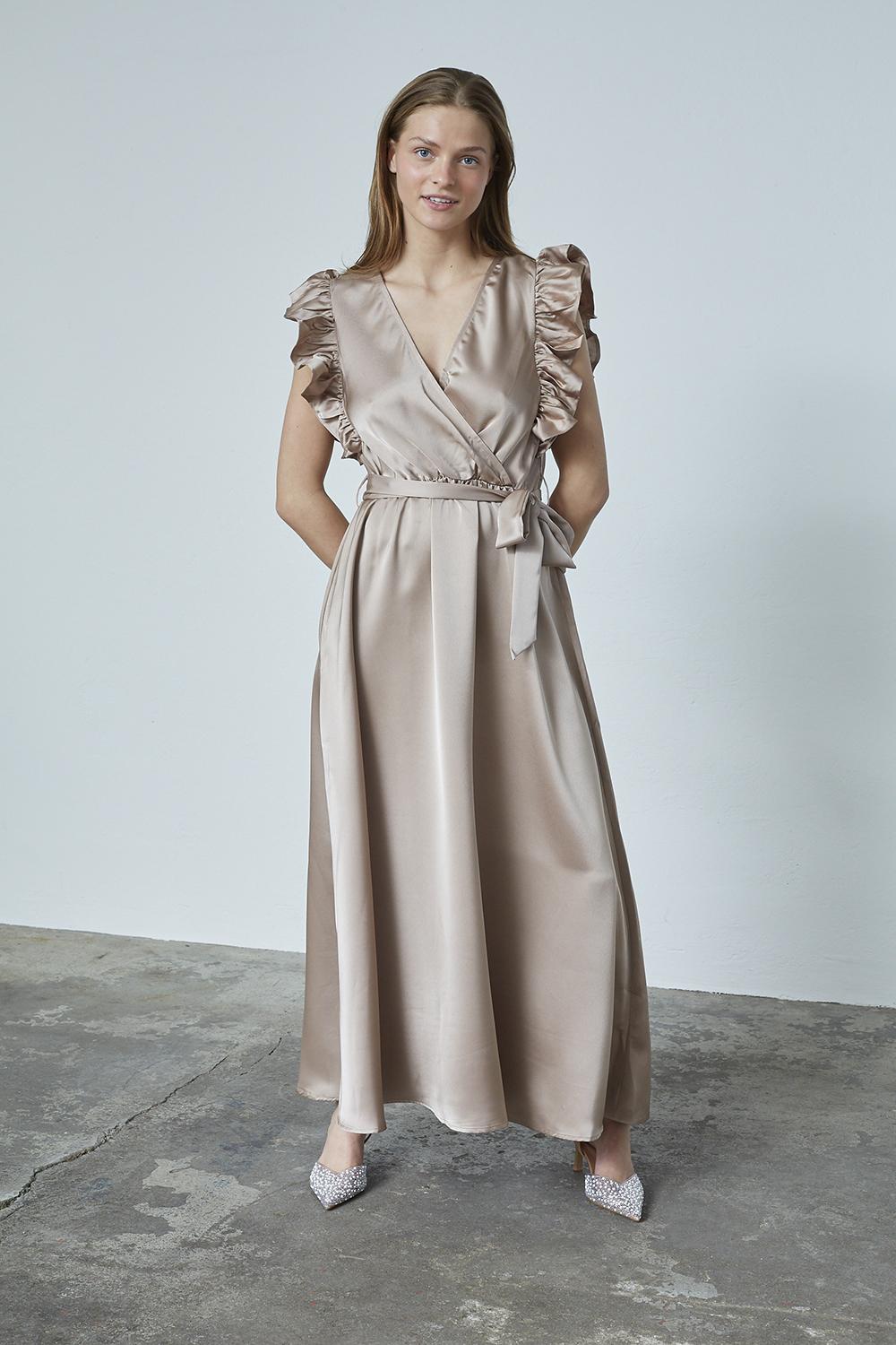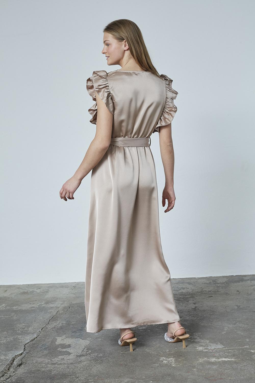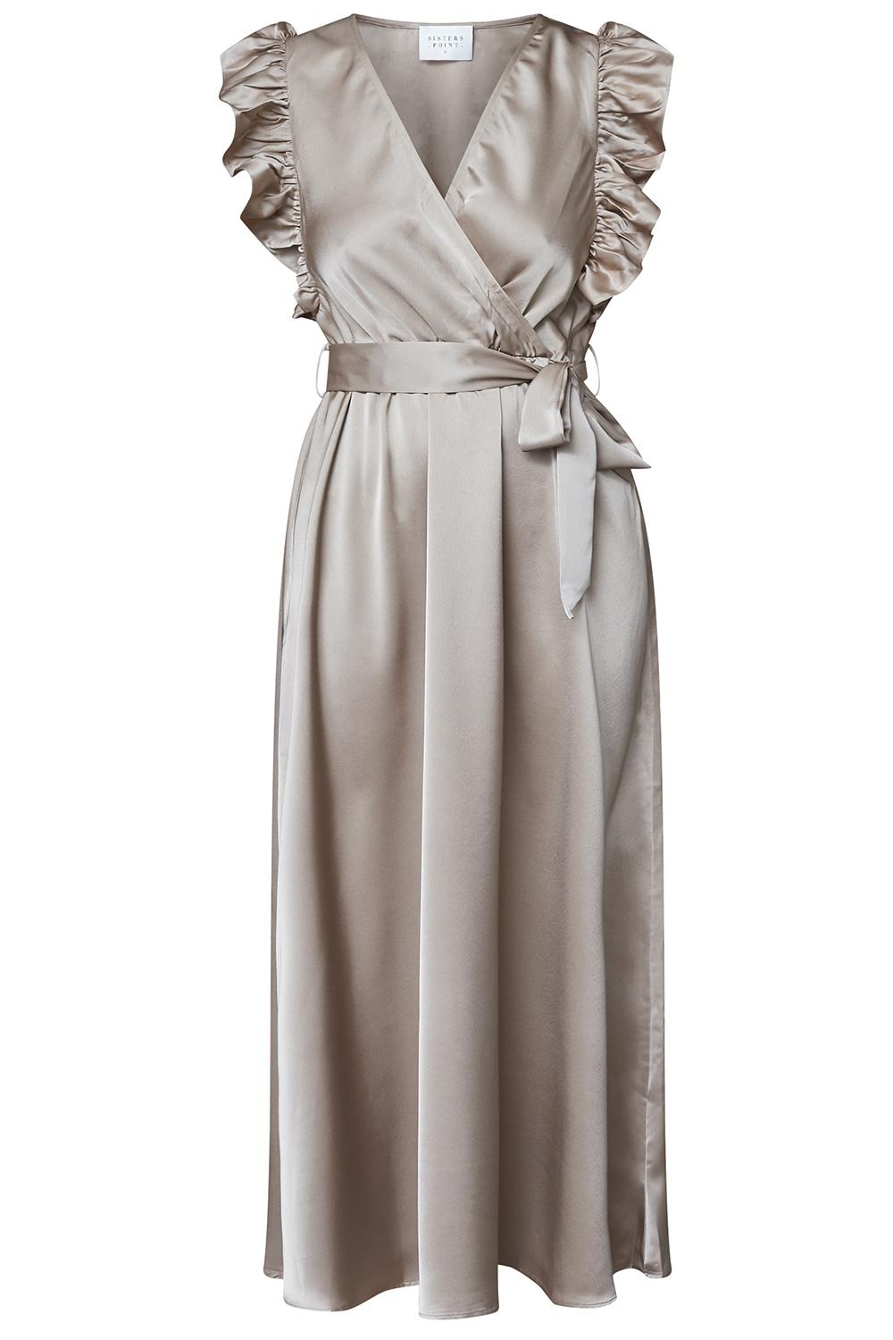 Deze elegante lange jurk van SisterS Point in de kleur dusty stone is perfect voor zomerse dagen. Het ontwerp onderscheidt zich door een stijlvolle overslaghals en de speelse ruches langs de mouwloze schouders. De jurk heeft een regular fit, wat zorgt voor een ontspannen en comfortabele pasvorm. Het gebruikte materiaal van 100% polyester geeft een subtiele glans en voelt zacht aan op de huid. De taille wordt op een charmante manier geaccentueerd met een bijpassende strikceintuur, die zorgt voor een verfijnd silhouet. Dankzij het veelzijdige design is deze jurk een uitstekende keuze voor zowel casual als meer formele gelegenheden. Draag hem met sneakers voor een alledaagse, relaxte look, of combineer hem met hakken voor een elegante uitstraling op een zomerse avond. De zachtere tonen van de dusty stone kleur maken deze jurk een stijlvolle toevoeging aan elke garderobe, geschikt voor verschillende situaties, van een tuinfeest tot een chique diner. Je voelt je altijd op je gemak in deze soepele en elegante jurk. Meer informatie: Totale lengte is 140 cm bij maat S.