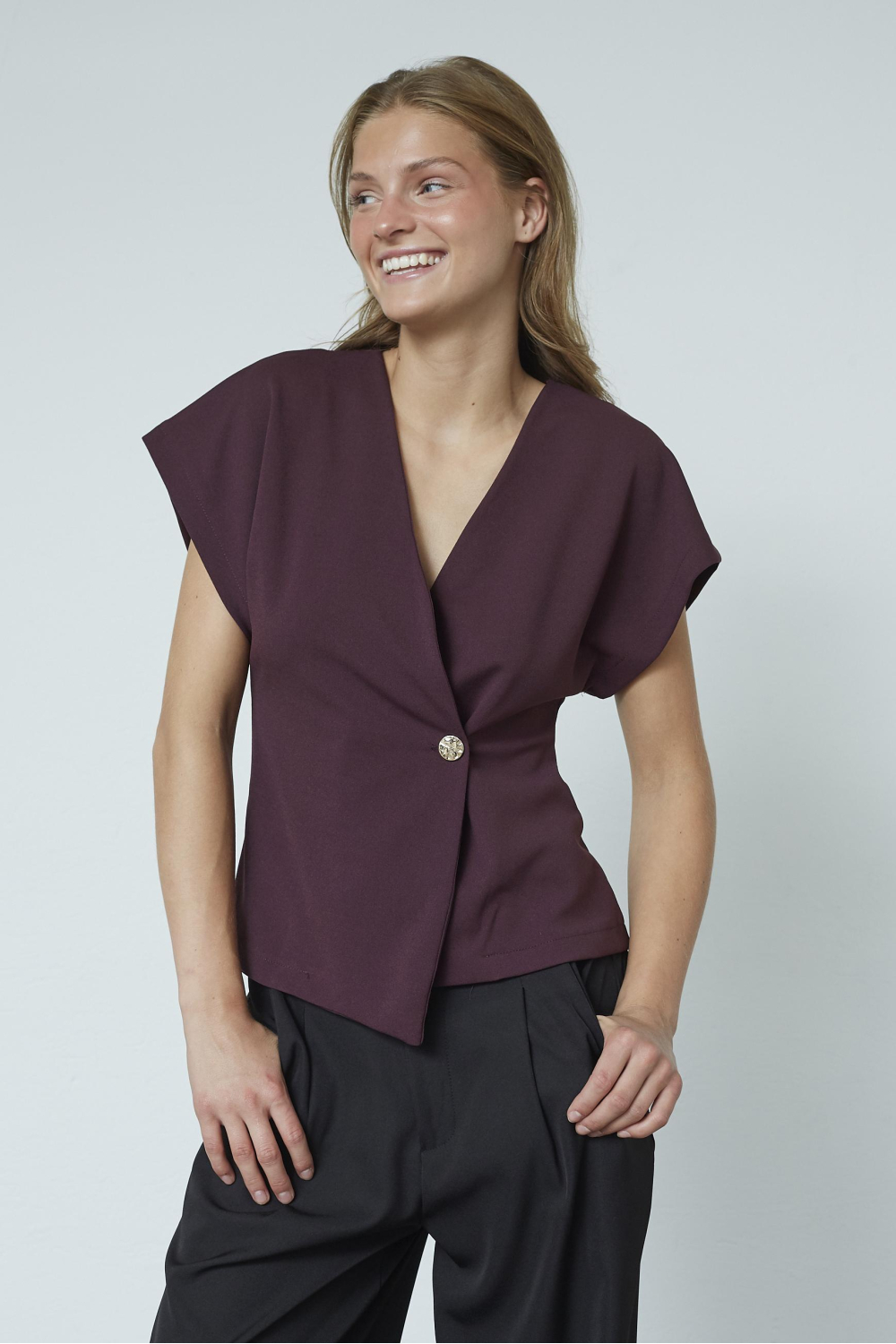 Dit casual T-shirt van SisterS Point is een stijlvolle toevoeging aan je herfstgarderobe. In de diepe bordeauxrode kleur en met een elegante V-hals, biedt het een moderne twist die makkelijk te combineren is met andere items. De regular fit maakt het T-shirt comfortabel voor dagelijks gebruik terwijl de opvallende knoopsluiting aan de voorkant een verfijnd detail toevoegt. Gemaakt van 95% polyester en 5% elastaan, voelt het materiaal zacht aan en biedt het voldoende stretch voor een perfecte pasvorm. De kapmouwen geven het T-shirt een luchtige uitstraling, ideaal voor zowel informele als iets formelere gelegenheden. Of je nu een dag op kantoor hebt of een gezellige avond uit plant, dit T-shirt past bij uiteenlopende settings. Combineer het met een nette pantalon voor een verfijnde look of draag het met een stoere jeans voor een meer relaxte stijl. Dankzij de normale lengte blijft het T-shirt zowel stijlvol als praktisch in verschillende outfits.