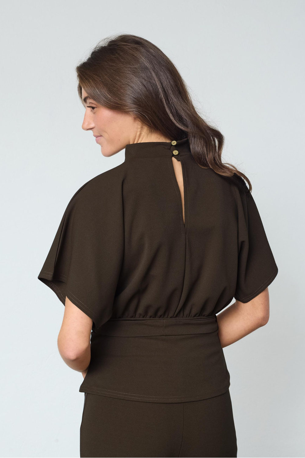 Dit bruine T-shirt van SisterS point biedt een casual uitstraling met een elegante twist dankzij de high neck en de stijlvolle, korte mouwen. Het T-shirt heeft een regular pasvorm en is gemaakt van een comfortabele mix van 95% polyester en 5% elastan, waardoor het perfect aansluit zonder in te boeten op bewegingsvrijheid. De subtiele knoopsluiting aan de achterkant zorgt voor een verfijnde touch. De normale lengte en het bijpassende ceintuur maken dit T-shirt veelzijdig inzetbaar, of je nu een dagje uit plant of een informele bijeenkomst hebt. Het flatterende silhouet en de zachte stof maken het geschikt voor diverse gelegenheden, van een gezellige avond met vrienden tot een ontspannen werkdag. Combineer het met een strakke broek of een zwierige rok voor een complete look die stijlvol en comfortabel is.