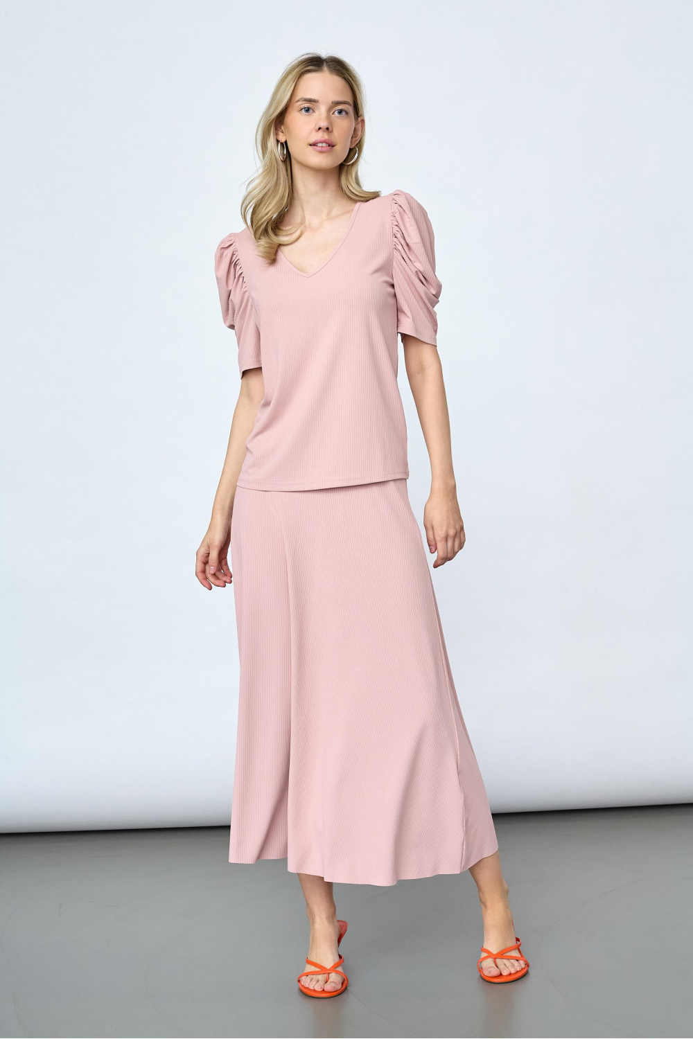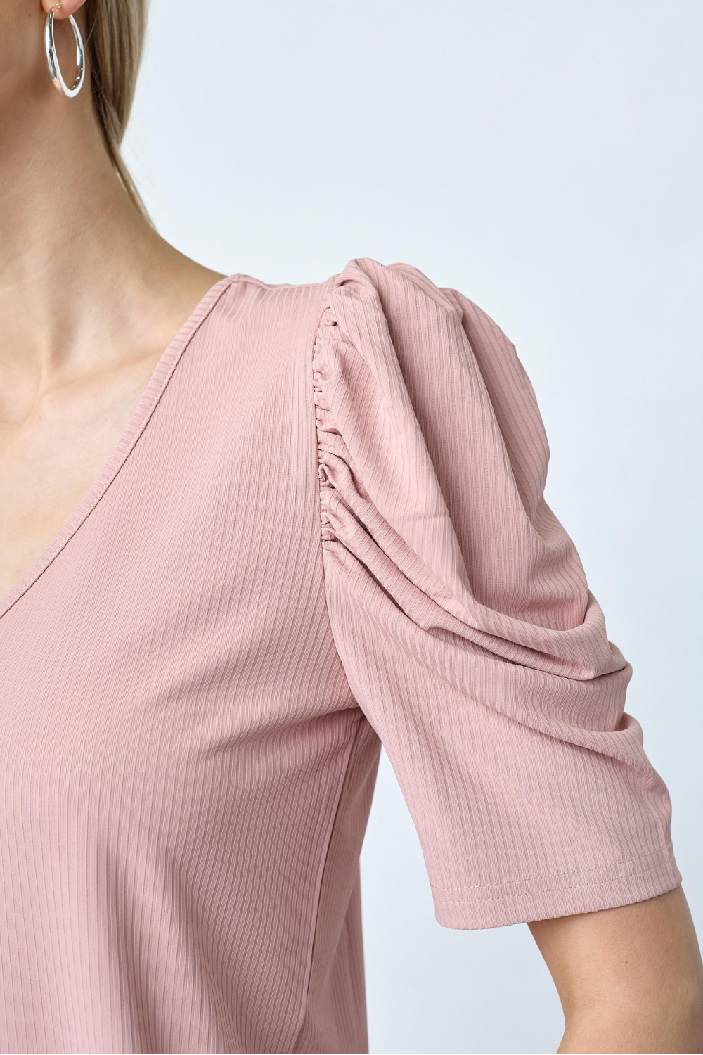 Dit mauvekleurige T-shirt van SisterS point is een elegante toevoeging aan je casual garderobe. Met een regular fit en een flatterende V-hals biedt dit T-shirt niet alleen stijl, maar ook comfort gedurende de dag. De kortere mouwen en de normale lengte zorgen voor een luchtige look die perfect is voor zomerse gelegenheden. De ribstructuur geeft het shirt een subtiele textuur, terwijl de plooien op de schouders een speels detail toevoegen, ideaal voor informele ontmoetingen of een ontspannen dagje uit. Dit T-shirt is gemaakt van een mix van 95% polyester en 5% elastan, die zorgt voor duurzaamheid en een lichte stretch die je bewegingsvrijheid garandeert. Draag het met een lichte jeans of een vloeiende rok voor verschillende zomerse gelegenheden, van een dag in het park tot een gezellig terrasbezoek. Dankzij de zachte mauve tint kan je het T-shirt moeiteloos combineren met andere kleuren en stijlen, wat het tot een veelzijdig kledingstuk maakt dat bij elke outfit past.