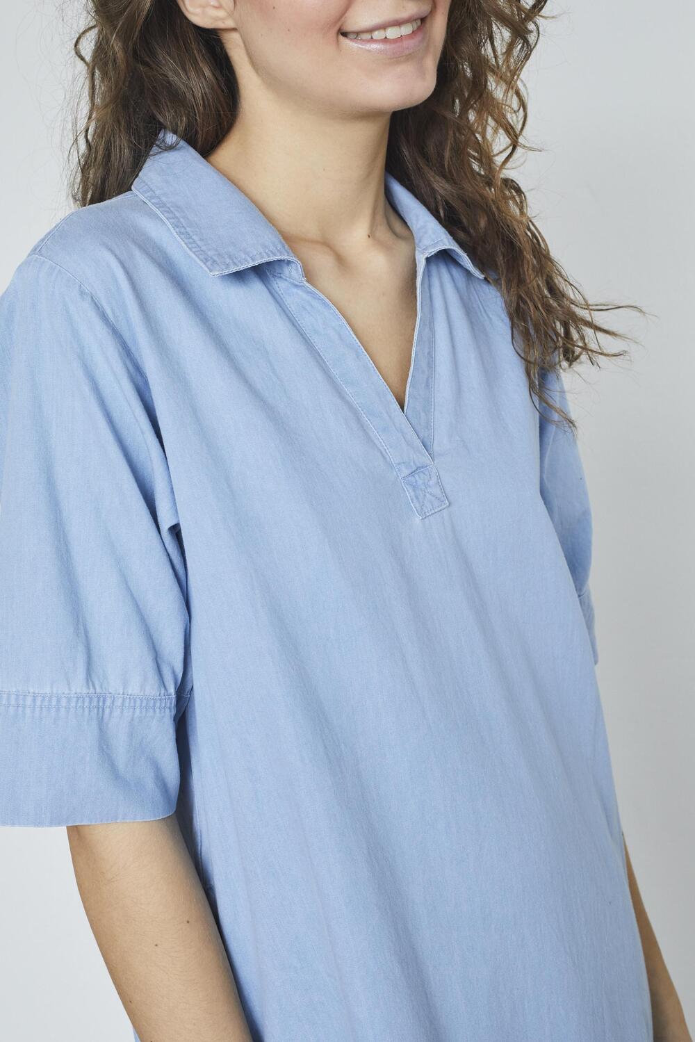 Deze lichte blauwe tuniek van SisterS Point voegt eenvoudig een frisse uitstraling toe aan je zomergarderobe. Gemaakt van 100% katoen, biedt deze tuniek een luchtig en comfortabel gevoel. De regular fit en de halflange lengte maken het een ideale keuze voor warme dagen. De tuniek heeft een puntkraag en praktische steekzakken, waardoor je deze gemakkelijk kunt combineren met je dagelijkse outfits. Perfect voor een casual uitstapje of een relaxte dag op kantoor. Dankzij de korte mouwen en de rinsewash afwerking blijft de tuniek licht en stijlvol. Het tijdloze en veelzijdige ontwerp maakt dat je deze tuniek moeiteloos kunt dragen tijdens een strandwandeling of een middag in de stad. Combineer het met sandalen voor een ontspannen look of sneakers voor een sportievere uitstraling. Met deze tuniek ervaar je zowel comfort als een modieuze touch, wat je plannen ook zijn.
