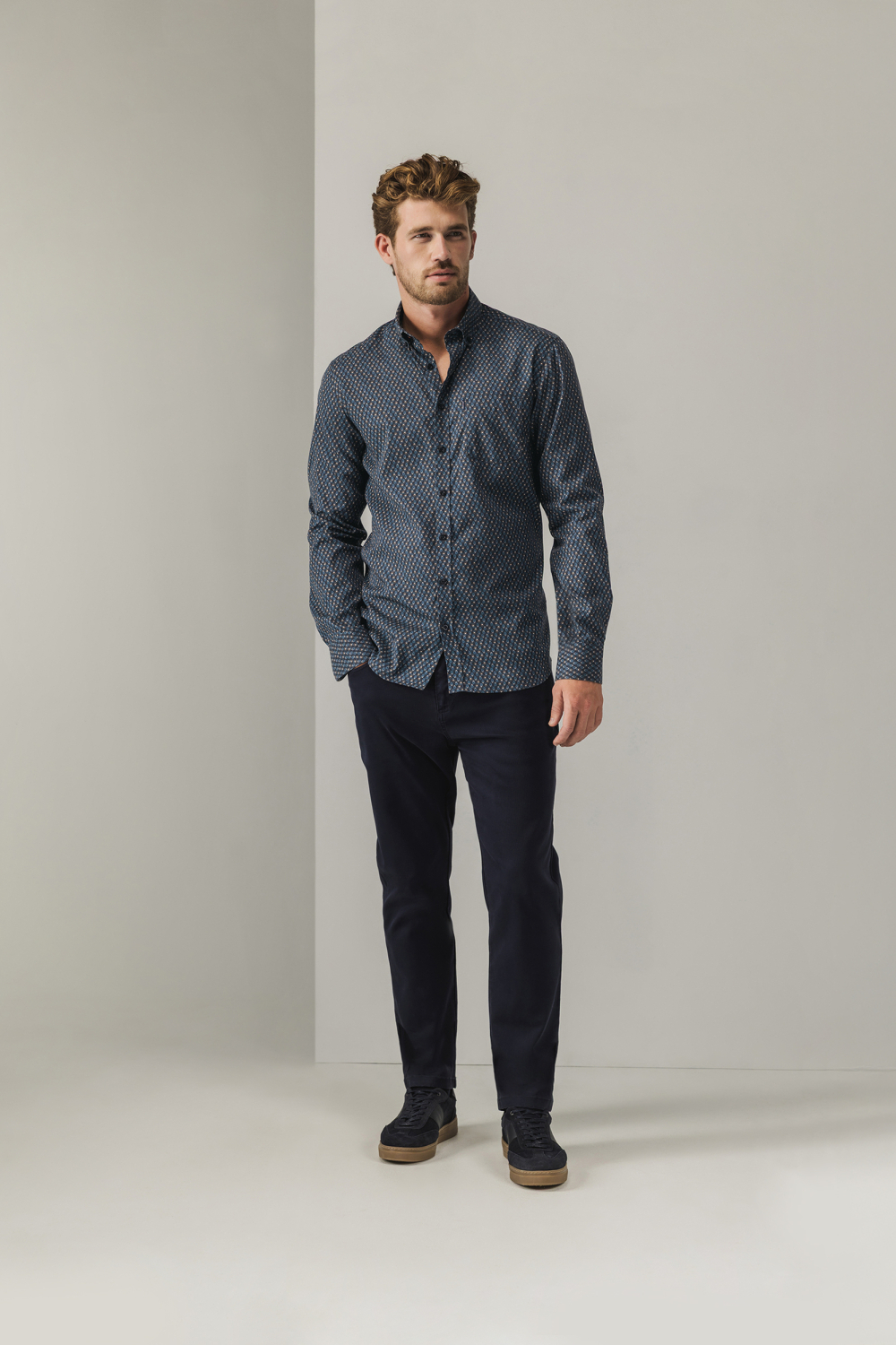 Dit grafische heren overhemd van State of Art biedt jou een stijlvolle optie voor de herfst. Met een regular fit pasvorm en een button-down kraag krijgt je outfit een moderne en toch casual uitstraling. De subtiele borstzak voegt een praktisch element toe zonder het strakke ontwerp te doorbreken. Gemaakt van 97% katoen en 3% elastaan, biedt dit overhemd comfort en bewegingsvrijheid, ideaal voor dagelijks gebruik. Het grafische patroon in de fabrikant kleur 5956 maakt dit overhemd tot een veelzijdig stuk dat zowel bij casual als semi-formele situaties past. Combineer het met een donkere jeans voor een ontspannen dagje uit, of draag het onder een blazer voor een zakelijke uitstraling. De lange mouwen en knoopsluiting zorgen voor extra verfijning, waardoor jij met gemak je stijl aan elke gelegenheid kunt aanpassen.