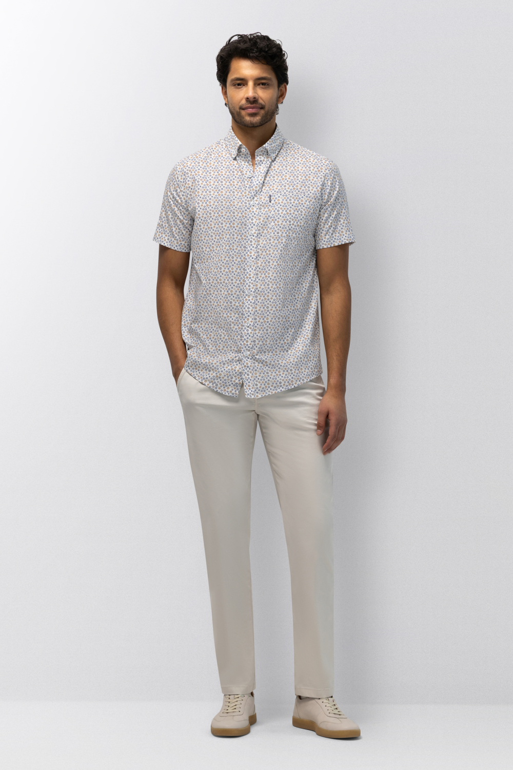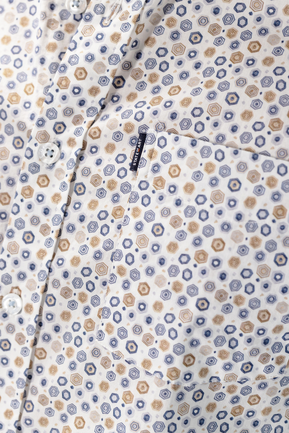 Dit casual overhemd van State of Art biedt je een comfortabele look voor de lente. Met zijn regular fit en korte mouwen, is het een perfecte keuze voor informele gelegenheden. Het overhemd is gemaakt van een ademende mix van 97% katoen en 3% elastan, waardoor het zacht aanvoelt en voldoende flexibiliteit biedt. De grafische print in zachte, veelzijdige kleuren geeft een speelse touch aan je outfit, terwijl de button-down kraag een nette afwerking biedt. Dit State of Art overhemd voegt moeiteloos een frisse uitstraling toe aan je garderobe. De subtiele borstzakken voegen praktische details toe, en de knoopsluiting zorgt voor een klassieke uitstraling. Combineer het met een lichte chino voor een ontspannen middag in het park of draag het met jeans voor een avondje uit met vrienden. Dankzij het veelzijdige patroon en de normale lengte is dit overhemd een veelzijdige aanvulling op je lente-look.