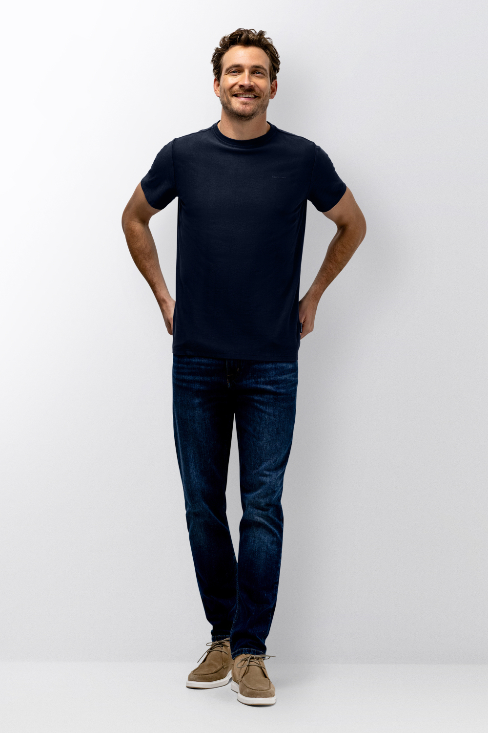 Dit casual T-shirt van State of Art is een veelzijdige keuze voor elke man. Ontworpen met een flatterende regular fit, is het T-shirt gemaakt van 100% katoen, waardoor het comfortabel en ademend is voor elke dag. Het visgraatpatroon voegt een subtiele textuur toe die het shirt net dat beetje extra geeft. Met een klassieke ronde hals en korte mouwen, is het een perfecte match voor de lente. Dankzij het tijdloze design kun je dit T-shirt eenvoudig combineren met je favoriete jeans voor een relaxte look, of draag het onder een licht jasje voor een meer geklede uitstraling. De donkerblauwe kleur maakt het een veelzijdige toevoeging aan je garderobe, geschikt voor zowel een casual dagje uit als een informele bijeenkomst. Kortom, het State of Art T-shirt biedt de perfecte balans tussen stijl en comfort.