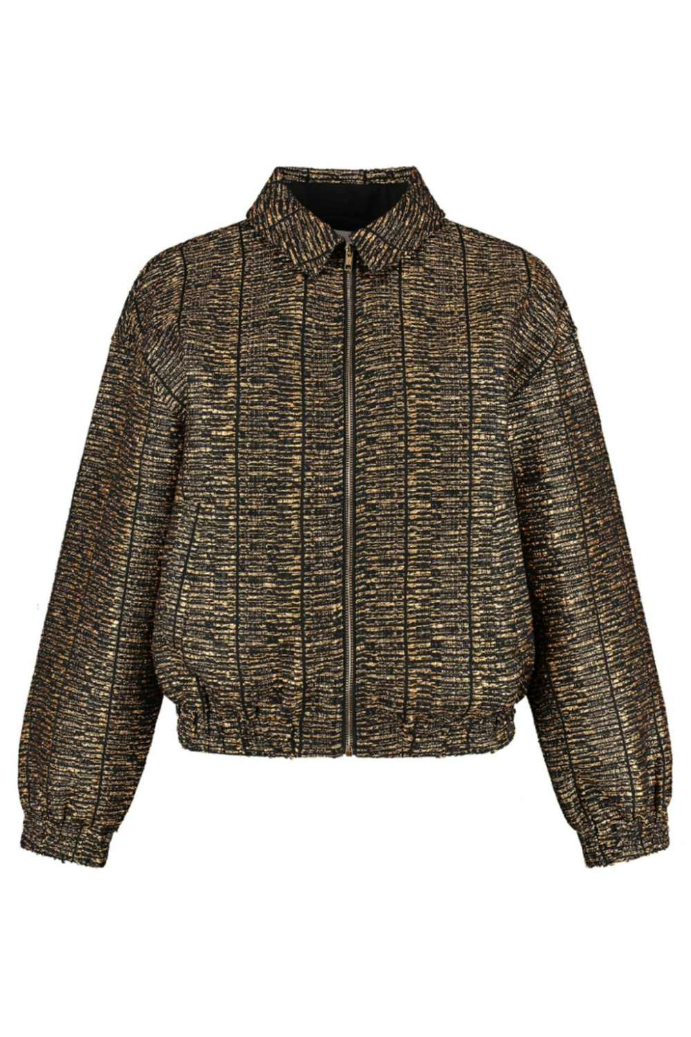 Deze stijlvolle zwarte jas van Studio Amaya is een perfecte aanvulling op je wintergarderobe. De jas heeft een opvallend glitterpatroon dat een vleugje glamour toevoegt aan jouw casual look. Dankzij de regular fit en de comfortabele polyester voering zit de jas heerlijk en houd jij je warm tijdens de koude winterdagen. De jas heeft een ritssluiting en een klassieke puntkraag, waardoor hij zowel praktisch als modieus is. De korte lengte en de lange mouwen maken deze jas veelzijdig voor verschillende gelegenheden. Draag hem naar een avondje uit of gewoon tijdens een dagelijkse wandeling. De steekzakken bieden ruimte voor je essentials en voegen functionaliteit toe aan dit stijlvolle ontwerp. Gemaakt van een hoogwaardige mix van polyester en elastaan, biedt de jas niet alleen comfort maar ook een subtiele stretch voor een relaxte draagervaring. Meer informatie: De totale lengte is 59 cm bij maat S.