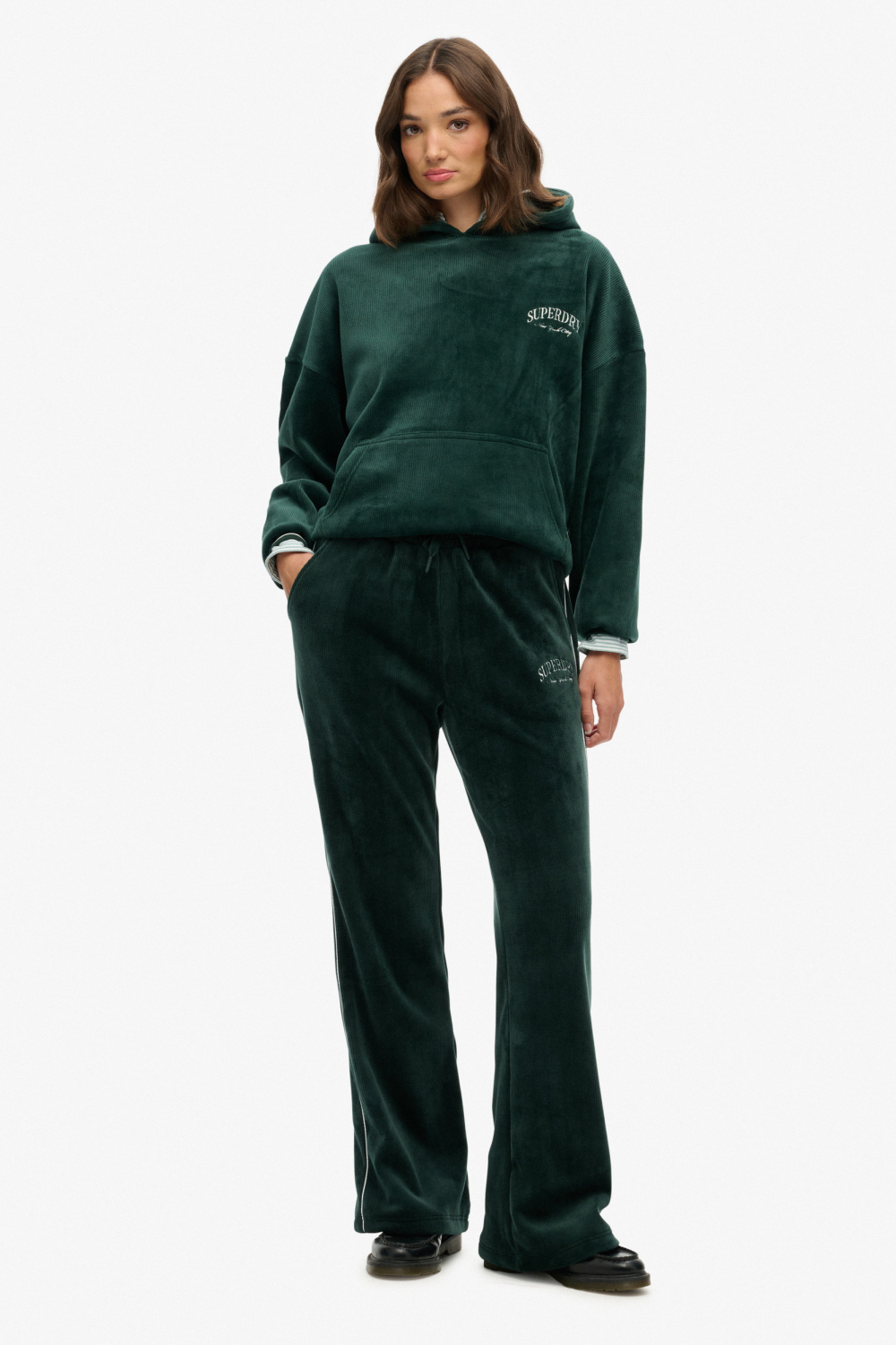 Deze stijlvolle Superdry broeken in een warme "27E Enamel Green" kleur zijn de perfecte aanvulling voor je casual garderobe dit herfstseizoen. Gemaakt van een comfortabele mix van 94% polyester en 6% elastan, biedt de ribstof niet alleen een aangename zachtheid, maar ook de nodige flexibiliteit. De straight fit pasvorm en de regular waist zorgen voor een moeiteloze en comfortabele look, ideaal voor een relaxte dag of als je op pad bent zonder in te boeten aan stijl. De elastische boord maakt het aantrekken gemakkelijk, terwijl de praktische steekzakken je van gemak voorzien voor kleine essentials. Of je nu op zoek bent naar gemak voor een dagje thuis of iets comfortabels om te dragen tijdens een informele bijeenkomst, deze Superdry broeken zijn een uitstekende keuze. De subtiele, doch opvallende Superdry branding en het ribpatroon geven een speelse touch aan je outfit. Combineer deze broeken met een eenvoudige top of hoodie voor een complete en comfortabele ensemble, die je makkelijk van dag tot avond kan dragen. Met deze broeken geniet je van een combinatie van stijl en comfort, geschikt voor elke gelegenheid.