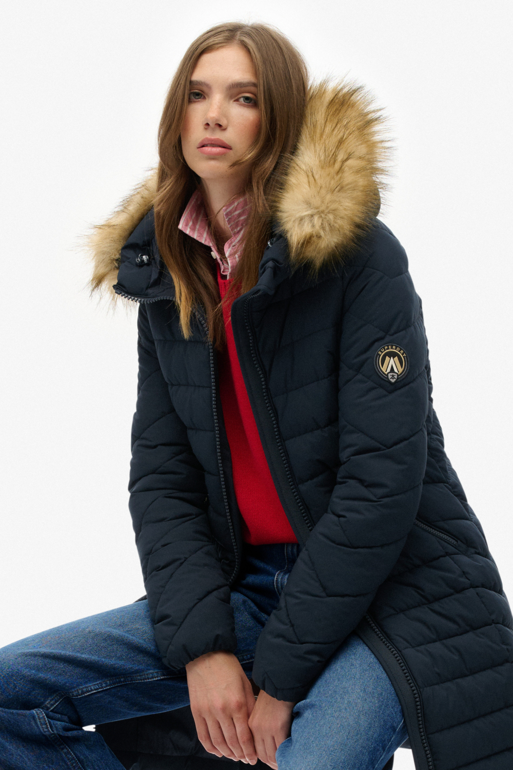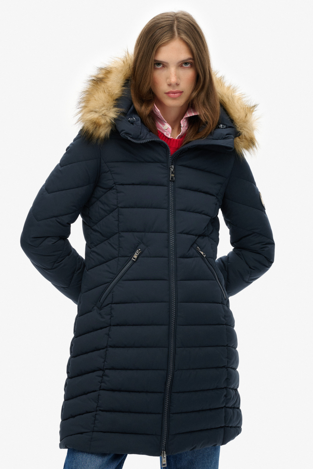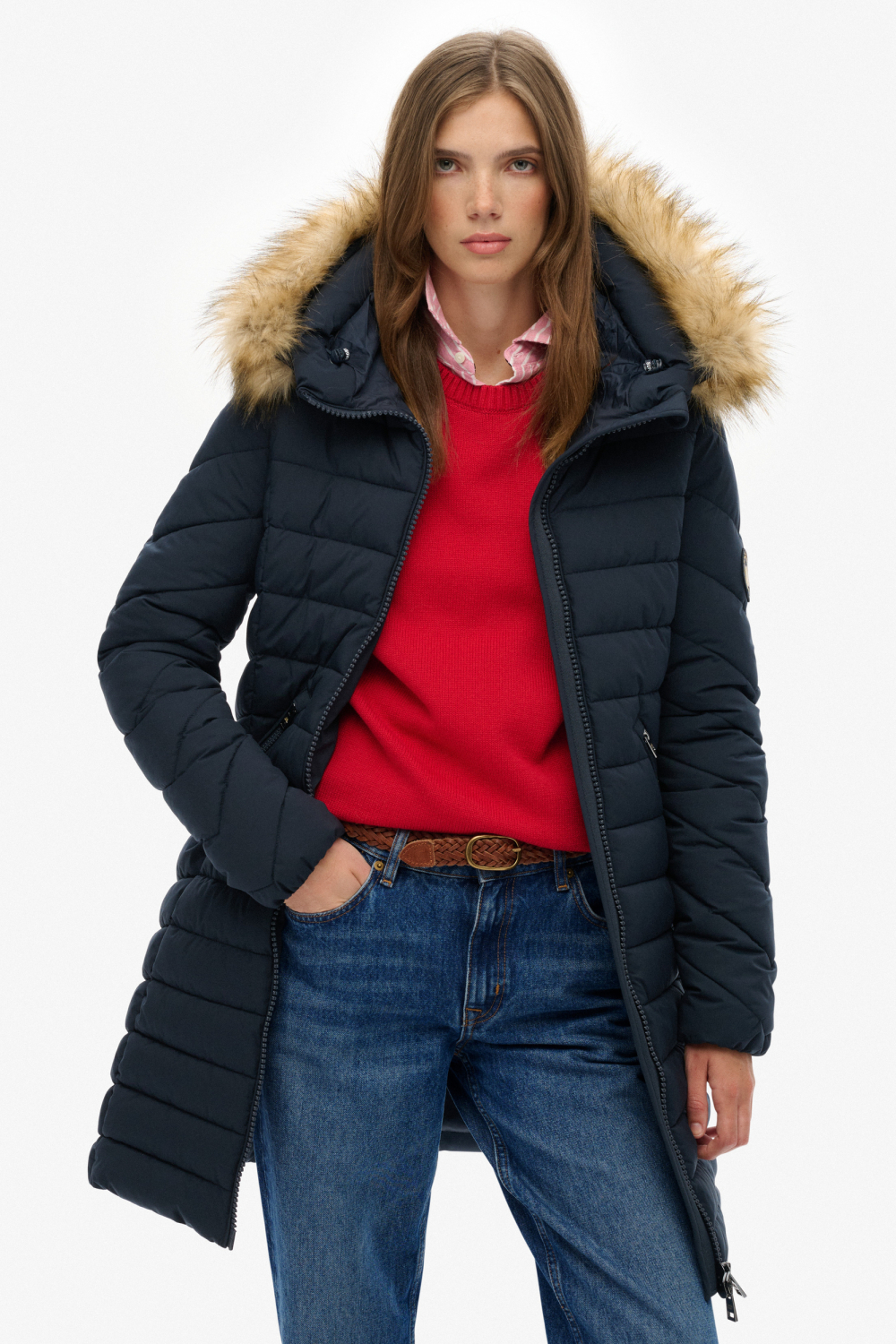 Deze navy winterjas van Superdry is een perfecte keuze voor de koudere maanden. De jas is gemaakt van 100% gerecycled polyester en biedt een duurzame optie die zowel stijlvol als functioneel is. De gewatteerde voering houdt je warm, terwijl de halflange lengte zorgt voor extra bescherming tegen de kou. Dankzij de regular fit sluit de jas mooi aan, zonder in te boeten op comfort. De capuchon, afgewerkt met een opvallende bontkraag, voegt een vleugje luxe toe en maakt de jas geschikt voor allerlei gelegenheden, van een stadswandeling tot een dagje in de natuur. De ritszakken zorgen ervoor dat je veilig je spullen kunt opbergen, en de ritssluiting maakt het gemakkelijk om de jas snel aan en uit te trekken. De donkere kleur biedt een tijdloze uitstraling die eenvoudig te combineren is met diverse outfits. Draag hem met een jeans voor een ontspannen look of combineer met een nette broek voor een meer geklede gelegenheid. Met deze jas ben je niet alleen klaar voor de winter, maar kies je ook voor een stijlvolle en verantwoorde toevoeging aan je garderobe. Meer informatie: De totale lengte is 85cm bij maat S.