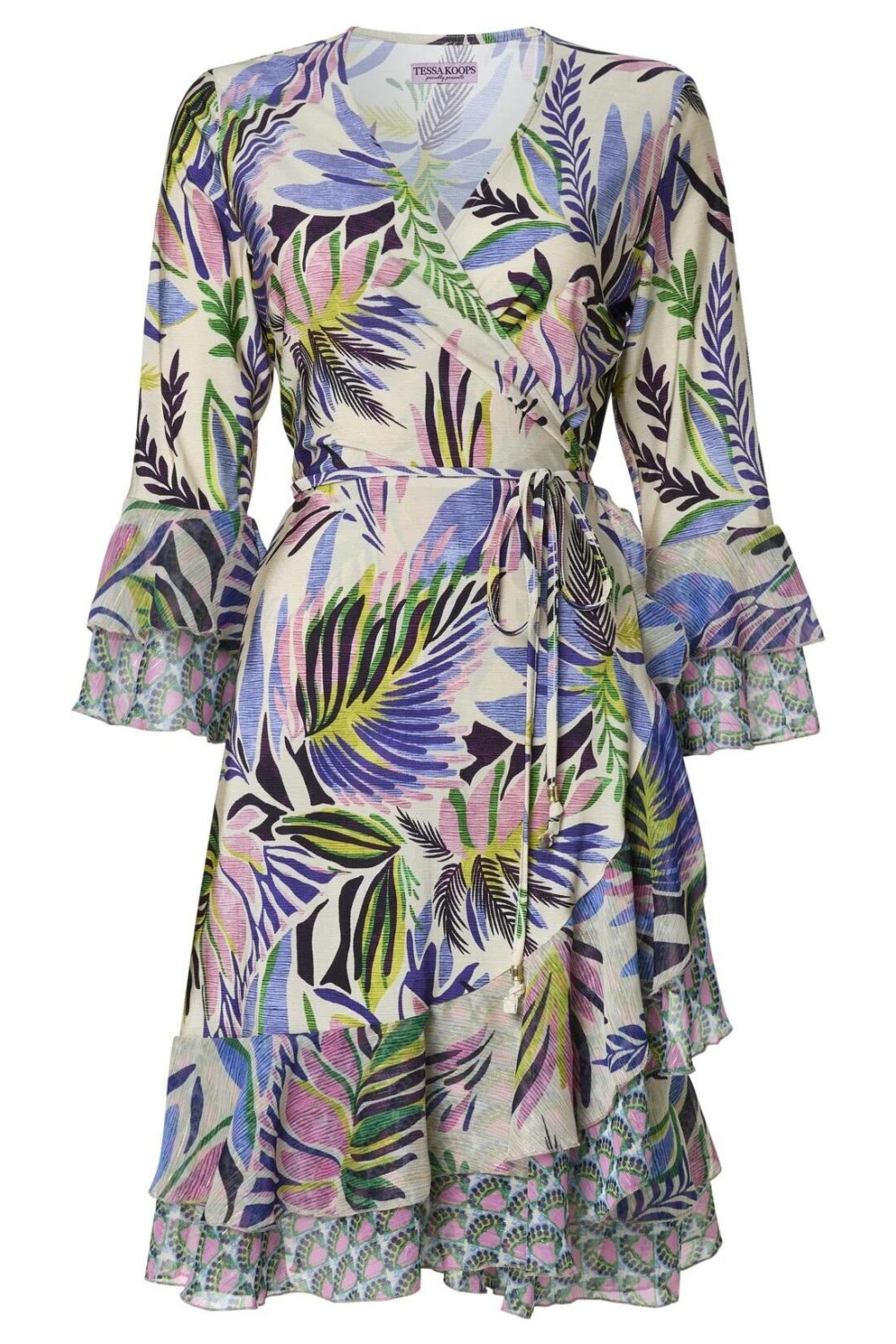 Deze kleurrijke zomerse jurk van Tessa Koops is een stijlvolle keuze voor elke zomerse gelegenheid. Met een prachtig grafisch patroon in levendige kleuren zoals blauw, roze en groen, voel jij je direct opgewekt en fris. De jurk heeft een comfortabele regular fit en een elegante overslaghals die subtiel je decolleté accentueert. Het strikkoord zorgt ervoor dat je de pasvorm speels kunt aanpassen, wat bijdraagt aan een ontspannen casual stijl. Gemaakt van 88% rayon en 12% elastan, biedt de jurk een lichte en luchtige draagervaring die geschikt is voor warme zomerdagen. De halflange lengte en 3/4 mouwen geven deze jurk een verfijnd karakter, terwijl de speelse ruches aan de mouwen en zoom voor een charmante finishing touch zorgen. Perfect te combineren met sandalen voor een dagje strand of een wandeling langs de boulevard. Waar je ook naartoe gaat, deze Tessa Koops jurk laat je stralend voor de dag komen. Meer informatie: De totale lengte is 100 cm bij maat S.