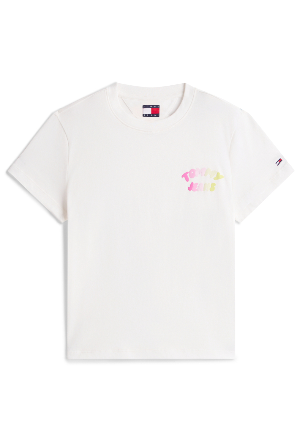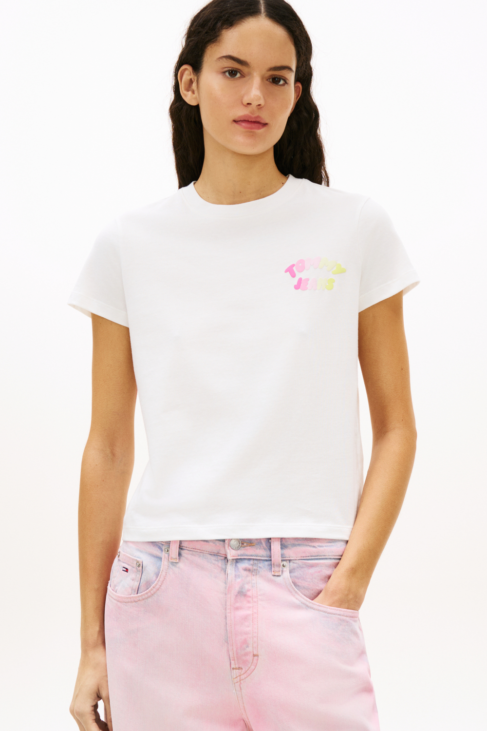 Dit casual dames T-shirt van Tommy Jeans is een verfijnde keuze voor je zomeroutfit. Het T-shirt, vervaardigd uit 100% katoen, biedt je comfort en ademend vermogen op warme dagen. De regular fit en ronde halslijn zorgen voor een eenvoudige maar stijlvolle look. Het subtiele tekstpatroon op de borst voegt een speelse touch toe, zonder te overheersen. Het wit van het T-shirt contrasteert mooi met de pastelkleurige accenten, waardoor het helemaal in het zomerse straatbeeld past. Dankzij zijn eenvoudige ontwerp is dit T-shirt veelzijdig en gemakkelijk te combineren met je favoriete outfits. Het is perfect voor een relaxte dag in het park of een casual ontmoeting met vrienden. Of je het nu draagt met een lichte jeans of een kleurrijke rok, dit T-shirt biedt talloze stijlopties. De korte mouwen en normale lengte maken het ideaal voor de warmere maanden, zonder in te boeten op comfort.