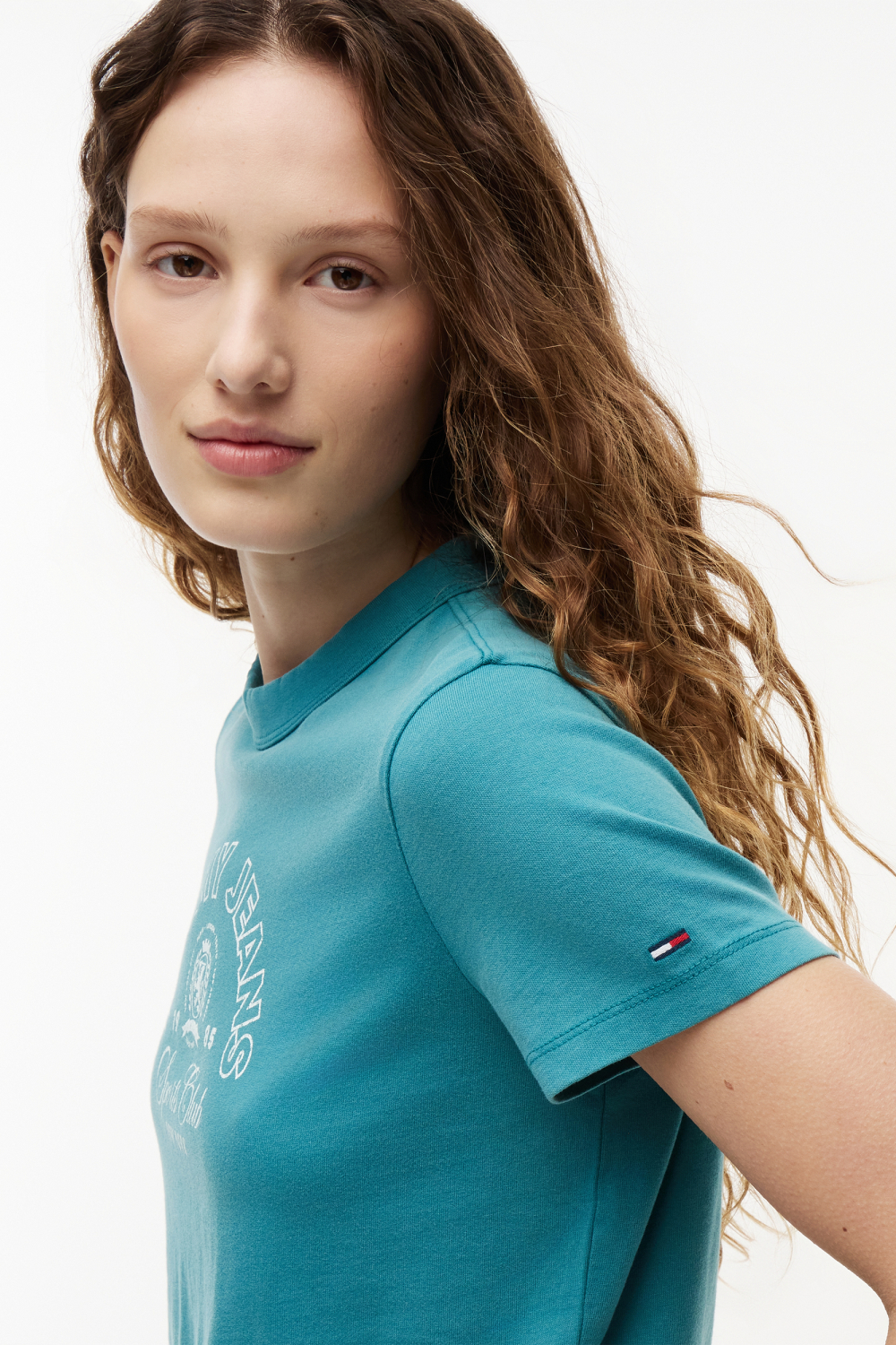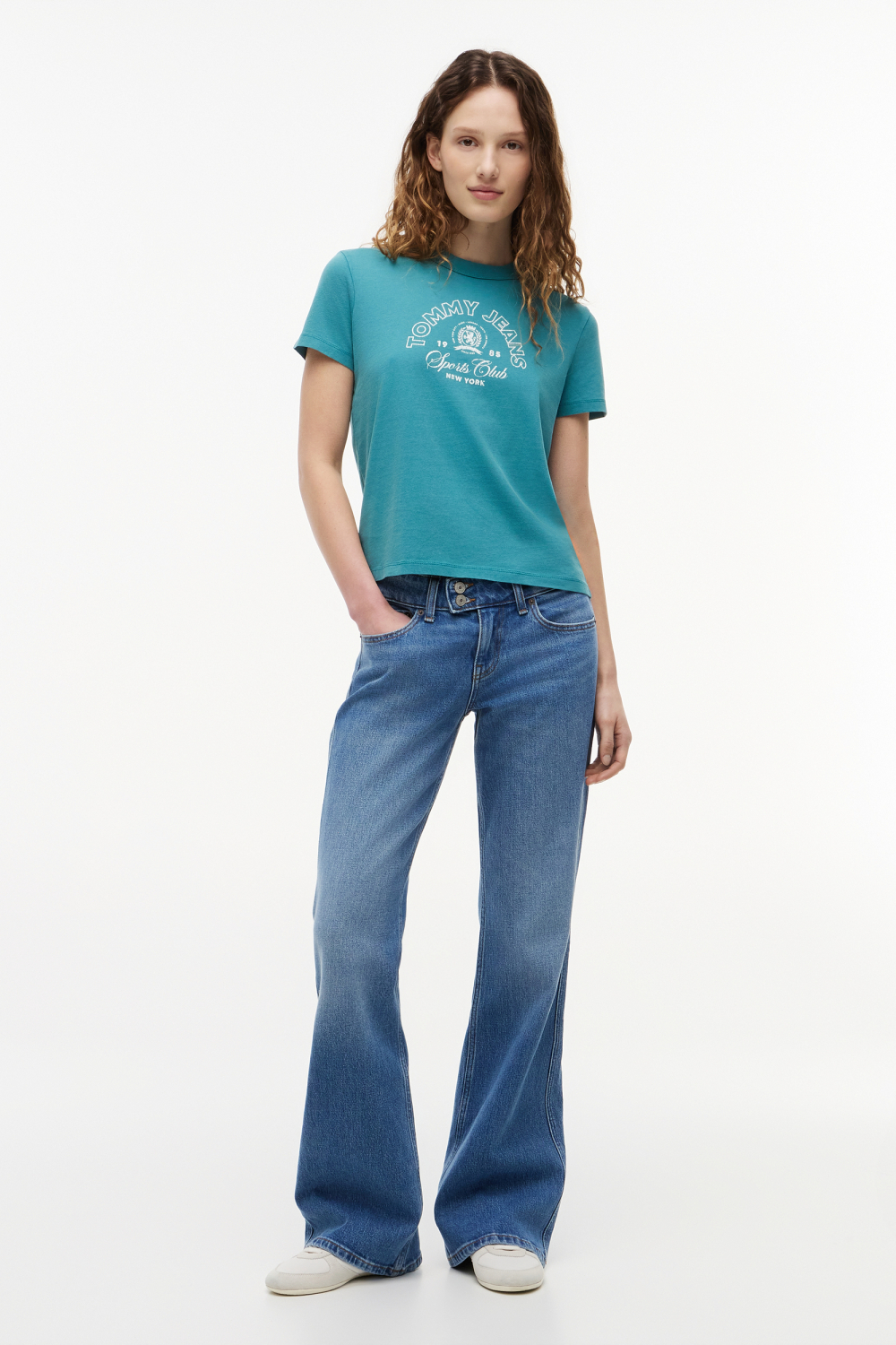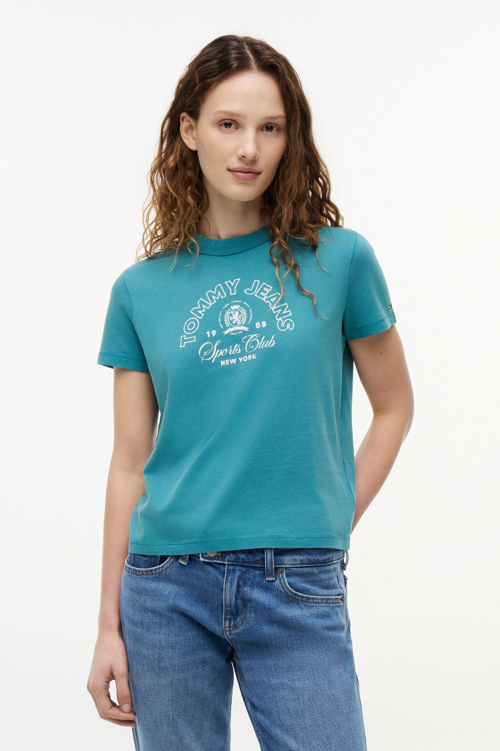 Dit zomerse Tommy Jeans T-shirt voor dames combineert stijl en comfort dankzij de regular fit en het gebruik van 100% katoen. Het T-shirt heeft een frisse, turquoise kleur en is voorzien van een opvallend tekstdesign met "Tommy Jeans Sports Club" op de borst. De ronde hals en korte mouwen geven het shirt een casual uitstraling die perfect past bij ontspannen zomeravonden of een dagje in de stad. Dit T-shirt is gemakkelijk te combineren met een spijkerbroek voor een relaxte look, of met een rokje voor een iets meer geklede uitstraling. Dankzij de normale lengte kun je het shirt zowel in als uit je broek dragen, afhankelijk van je persoonlijke stijl. Of je nu naar een festival gaat of een informele ontmoeting hebt, dit Tommy Jeans T-shirt biedt de veelzijdigheid die je zoekt in je garderobe.