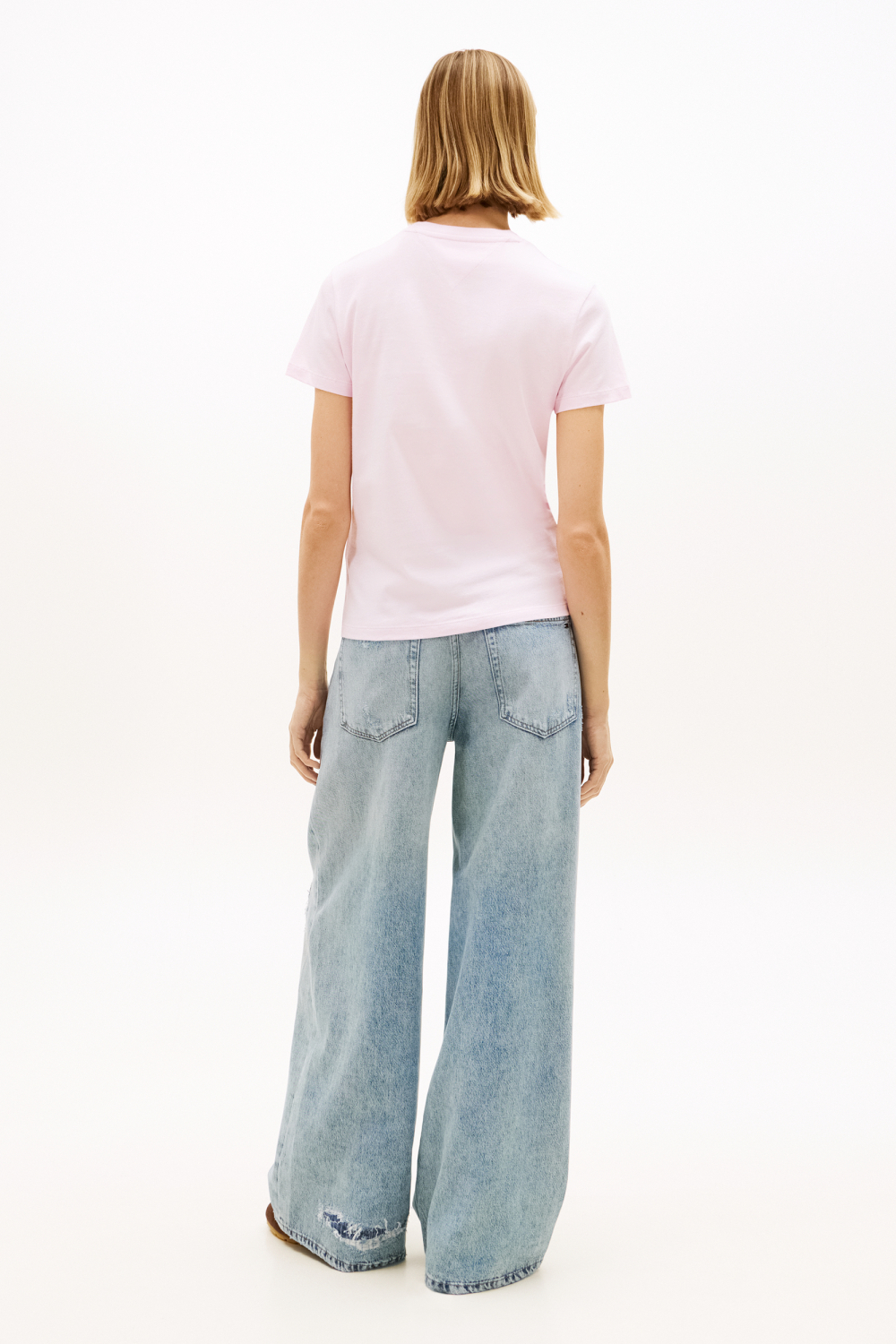 Het dames T-shirt van Tommy Jeans combineert casual stijl met een zomerse uitstraling. Dit lichtroze T-shirt, gemaakt van 100% katoen, zorgt voor comfortabel draagplezier tijdens warme dagen. De regular fit pasvorm zorgt voor een ontspannen look, waarbij de klassieke ronde hals een tijdloos element toevoegt. Het ontwerp is voorzien van een subtiel tekstpatroon, wat het geheel een speelse touch geeft. Dit shirt is een veelzijdige keuze, perfect voor informele zomeruitjes of een ontspannen dagje thuis. Combineer het moeiteloos met je favoriete jeans of een luchtige rok voor een frisse, moderne look. De korte mouwen en normale lengte maken het een uitstekende keuze voor diverse gelegenheden, van een strandwandeling tot een middag in het park. Met Tommy Jeans weet je zeker dat je kwaliteit en stijl in huis haalt.