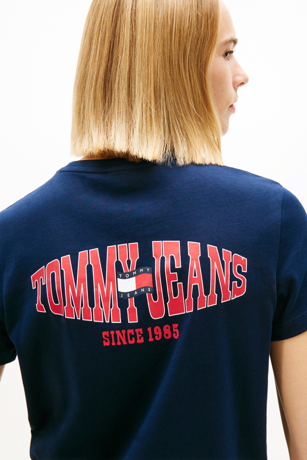 Dit comfortabele dames T-shirt van Tommy Jeans combineert stijl en eenvoud. Gemaakt van 100% katoen, biedt het een zachte touch en ademend vermogen, ideaal voor zomerse dagen. Met een regular fit pasvorm en een tijdloze ronde hals, past dit T-shirt perfect in een casual garderobe. De voorkant toont subtiel het iconische Tommy Jeans-logo, terwijl de achterkant een opvallende opdruk heeft van de merknaam en het jaartal 'Since 1985', wat een retro touch toevoegt. Door het speelse patroon is dit T-shirt van Tommy Jeans gemakkelijk te combineren. Draag het met een lichte jeans voor een relaxte look of maak het meer trendy met een wijde broek en sneakers. Dit shirt is perfect voor een dagje uit, een ontspannen bijeenkomst of gewoon voor die heerlijke zomerse ontspannen momenten. Met zijn duurzame materialen en tijdloze ontwerp, is het een betrouwbare aanvulling op je kledingkast.