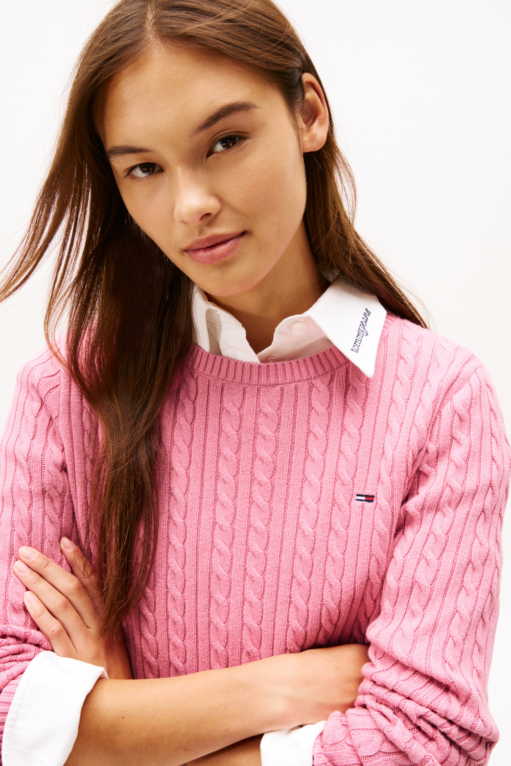 Deze kabelgebreide trui van Tommy Jeans is een stijlvolle toevoeging aan jouw wintergarderobe. De trui heeft een reguliere pasvorm en een ronde hals, waardoor hij veelzijdig en comfortabel is. Gemaakt van 100% katoen, biedt hij warmte en zachtheid op koude dagen. De subtiele roze kleur zorgt voor een speelse twist terwijl het kabelpatroon een klassiek element toevoegt. Deze trui is perfect om zowel casual als in nettere situaties te dragen, dankzij de finesse van het ontwerp. De Tommy Jeans trui laat zich moeiteloos combineren met een jeans voor een nonchalante look, of met een nette broek voor een meer geklede uitstraling. De lange mouwen en normale lengte maken hem ideaal voor verschillende gelegenheden, van een wandeling door het park tot een informele bijeenkomst. Het verfijnde logo op de borst voegt een kenmerkend accent toe, waardoor je altijd stijlvol voor de dag komt. Voeg dit veelzijdige kledingstuk aan je collectie toe en ervaar de tijdloze klasse van Tommy Jeans.