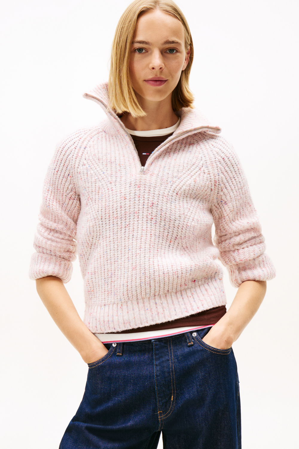 Deze gemêleerde knitwear trui van Tommy Jeans is een stijlvolle keuze voor het herfstseizoen. Met zijn zachte YBH Ancient White tint en speels gemêleerd patroon, biedt deze trui een subtiele kleurboost aan je outfit. De high neck en de ritssluiting geven een modern tintje en bieden extra warmte op koelere dagen. Dankzij de regular fit en de normale lengte, is het een veelzijdig stuk dat zowel comfort als stijl uitstraalt, perfect voor dagelijks gebruik. Of je nu naar je werk gaat of een gezellige wandeling maakt, deze Tommy Jeans trui past bij elke gelegenheid. Combineer hem met een jeans voor een casual look of draag hem over een nette blouse voor een meer verfijnde uitstraling. Met zijn lange mouwen en warme stof is deze trui een ideale keuze die je zonder moeite kunt matchen. Voeg hem toe aan je garderobe en geniet van een tijdloos en veelzijdig stuk dat nooit uit de mode raakt.